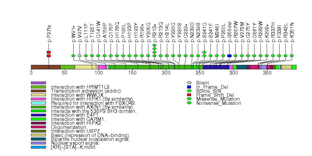 Figure S1. This figure depicts the distribution of mutations and mutation types across the TP53 significant gene.