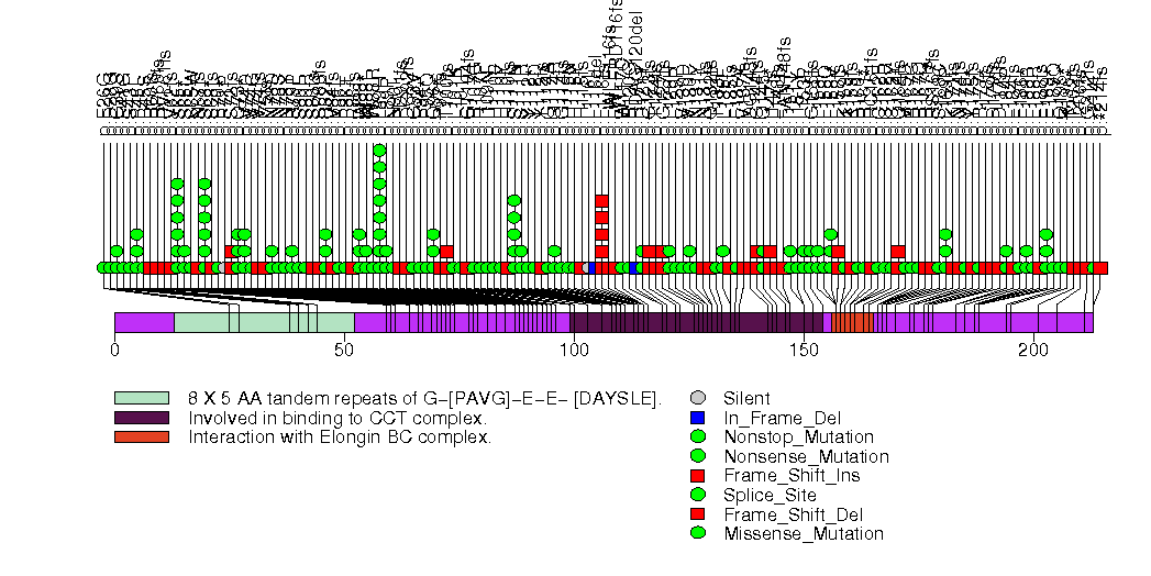 Figure S6. This figure depicts the distribution of mutations and mutation types across the VHL significant gene.