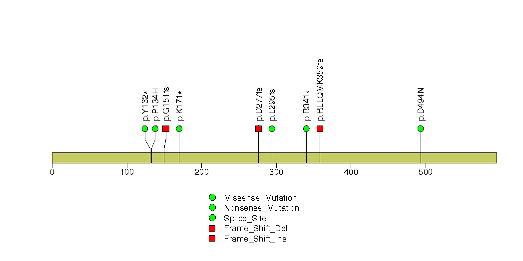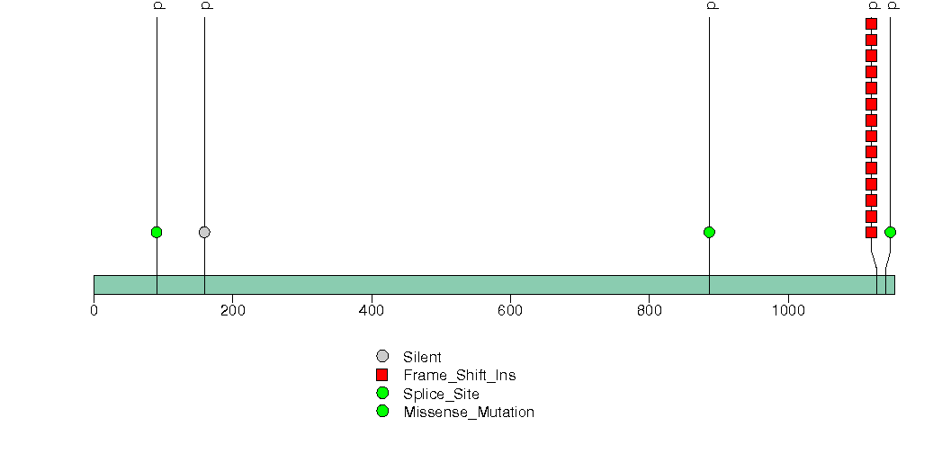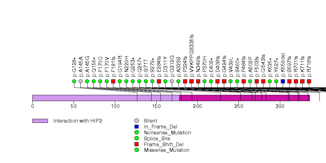 Figure S6. This figure depicts the distribution of mutations and mutation types across the PBRM1 significant gene.