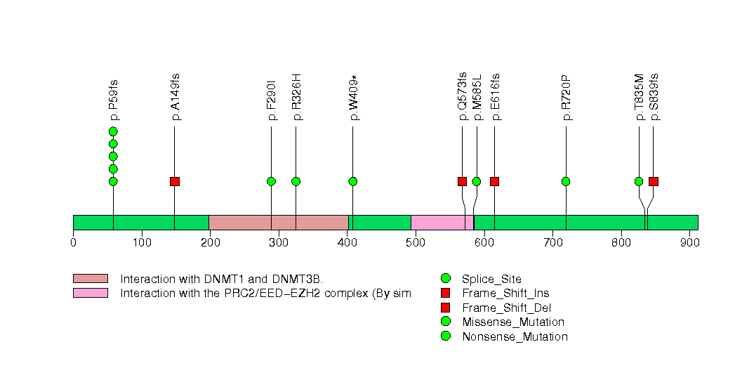 Figure S13. This figure depicts the distribution of mutations and mutation types across the DNMT1 significant gene.