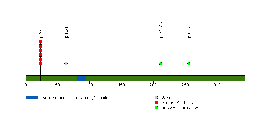 Figure S1. This figure depicts the distribution of mutations and mutation types across the EFNB3 significant gene.