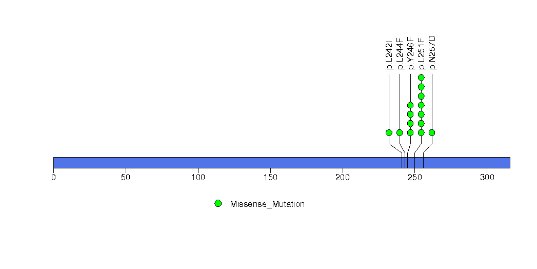 Figure S22. This figure depicts the distribution of mutations and mutation types across the DPEP2 significant gene.
