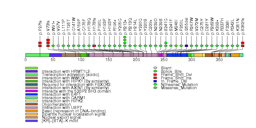 Figure S7. This figure depicts the distribution of mutations and mutation types across the TP53 significant gene.