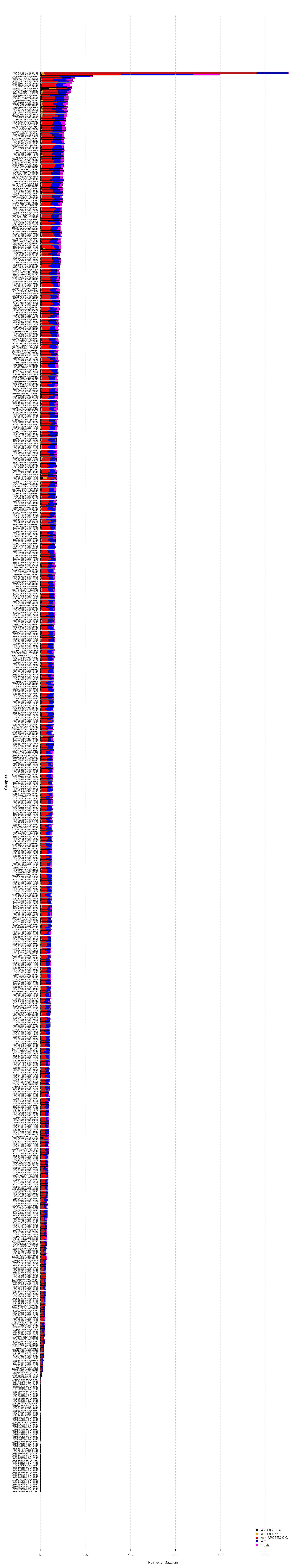 Figure 4. Get High-res Image Numbers of APOBEC and non-APOBEC mutations (X-axis) in each sample (Y-axis). All values are calculated based on the values in the columns “indels”, “substitutions”, and columns containing individual substitution types in the “*_sorted_sum_all_fisher_Pcorr.txt” file. “APOBEC to G” – number of tCw→tGw mutations; “APOBEC to T” – number of tCw→tTw mutations; “non-APOBEC C:G” – number of mutations in C:G base pairs not conforming to the APOBEC signature (= total of tCw→tAw plus all mutations in C not occurring in the tCw motif); “A:T” –- all mutations in A:T base pairs; “indels” – all indels. All counts include complementary mutations. Samples are ordered by total mutation counts in the descending order. Since only base substitutions are shown, bars with excessive numbers of non-substitution mutations may be shorter than the two flanking bars.