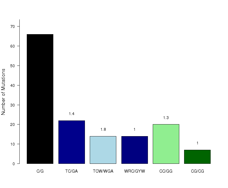 Figure 7. Get High-res Image The number of mutations within C- or G-coordinated clusters occurring in different known C- or G-specific mutation motifs. Counts are totaled among all samples. “C/G” – any mutation in C:G base pairs; “TC/GA” – any mutation in a less stringent APOBEC motif: tC (mutated nucleotide capitalized); “TCW/WGA” – any mutation in the stringent APOBEC motif: tCw; “WRC/GYW” – any mutation in the wrC motif for AID cytidine deaminase (r=A or G; y=C or T); “CC/GG” – any mutation in the cC motif for APOBEC3G; “CG/CG” – any mutation in the Cg (or CpG) motif frequently methylated (5me-C) and prone to deamination. Fold enrichments are calculated using values from the corresponding columns (including complementary mutations) in the “Totals” row of the “*_sorted_sum_G_C_clusters.txt” file. Fold enrichments for each signature (shown as numbers above the bars) are calculated the same as the fold enrichment for the APOBEC mutation motif. All three possible substitutions of C are included (i.e. to A, T and G). When tCw-specific APOBECs are the source of clustered mutations, both tC and tCw should be enriched with the latter being greater. Moreover, other C-specific mutation signatures should be depleted.