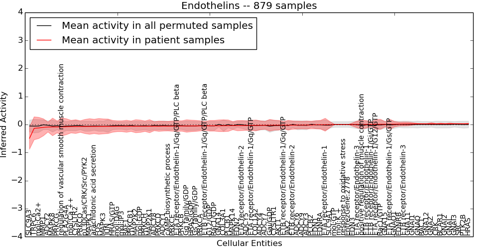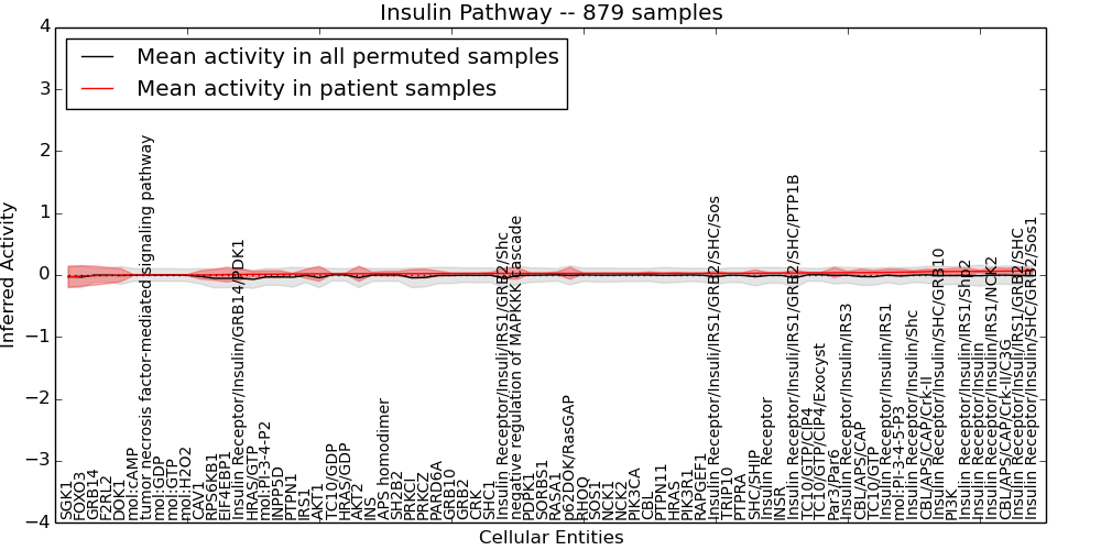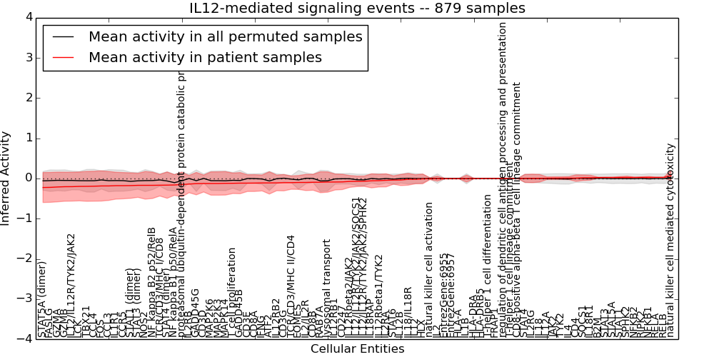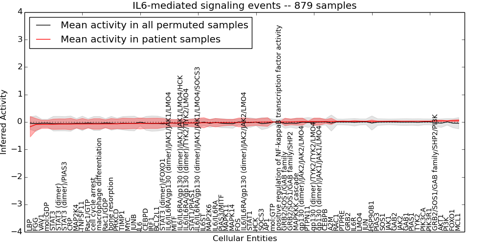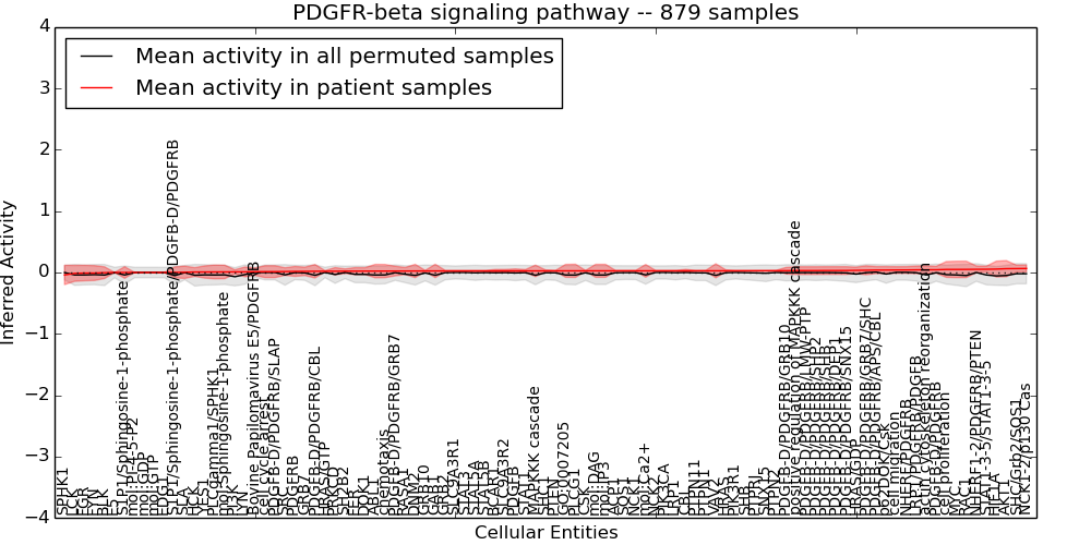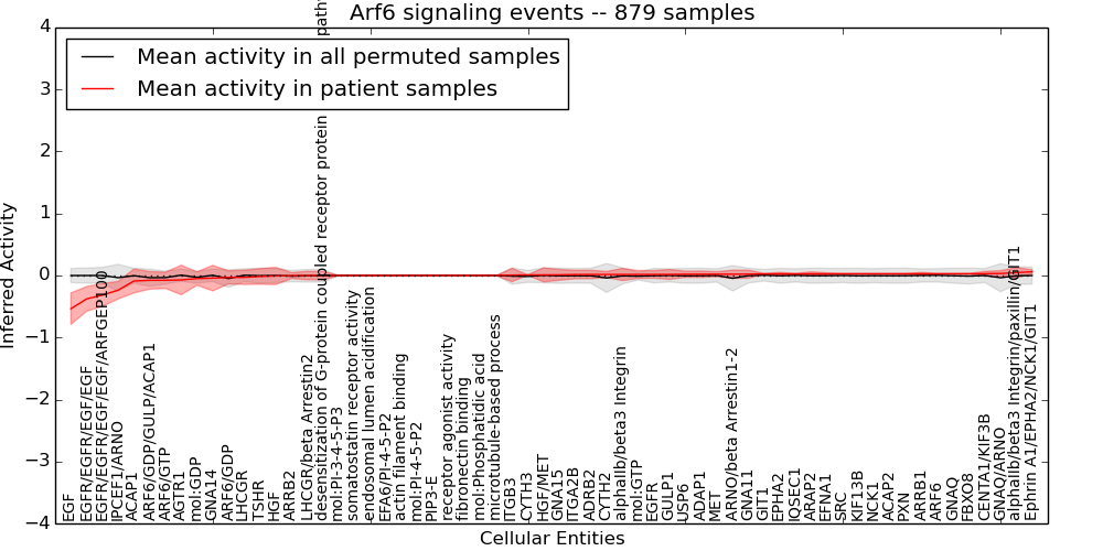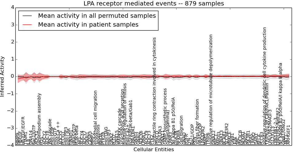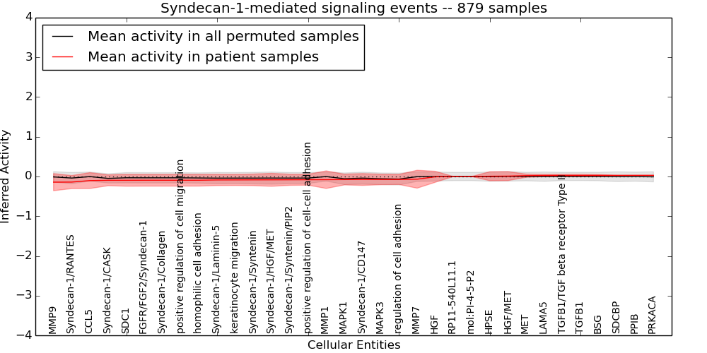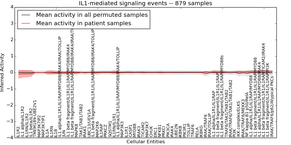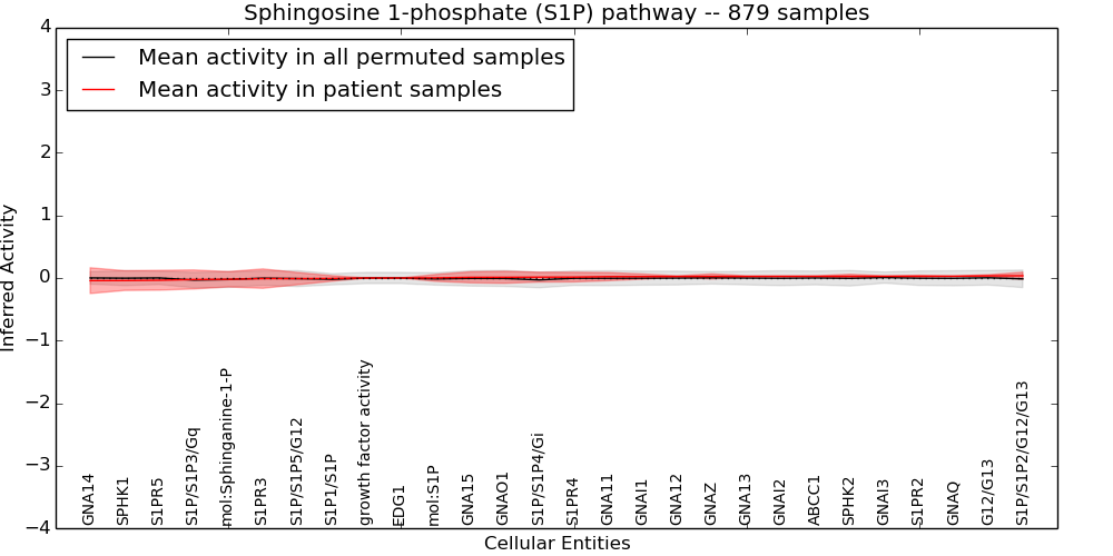 Figure S131. Get High-res Image This plot shows pathway concept perturbations across all samples against a permutation model. The concepts along the x-axis are sorted by lowest to highest mean activity for the real patient samples. Mean inferred activities are plotted along the y-axis as a colored band showing the average level and one standard deviation range. Real samples are shown in red and permuted samples in black.