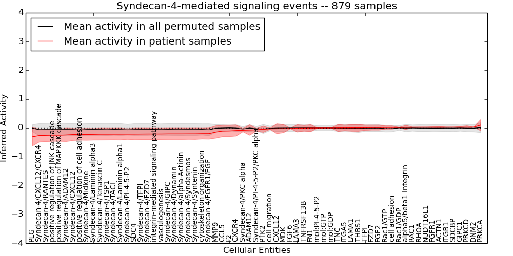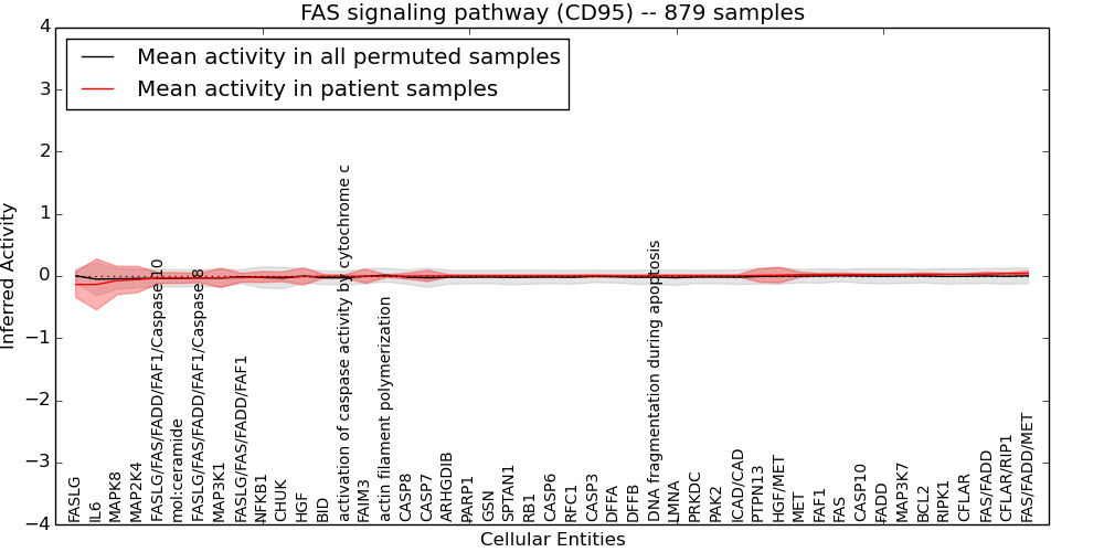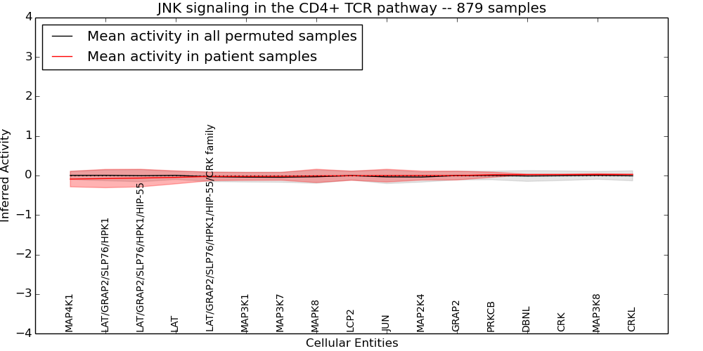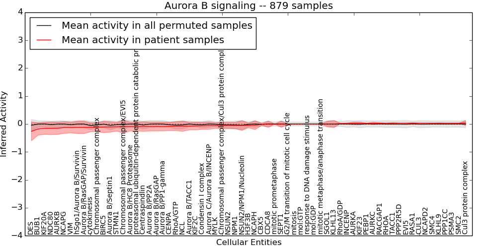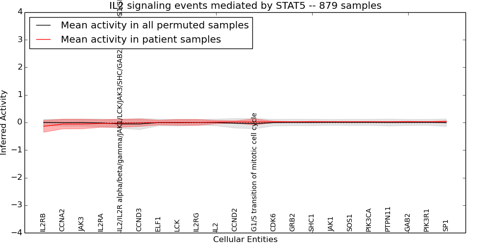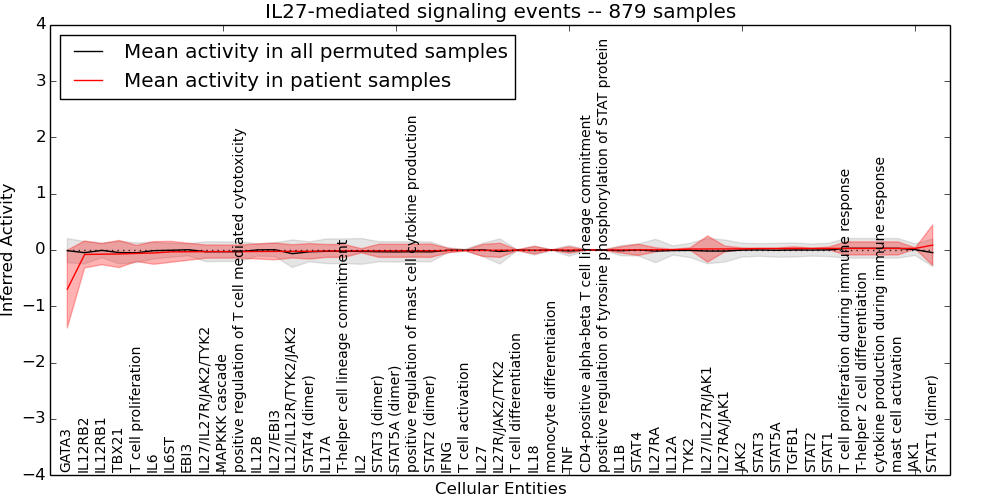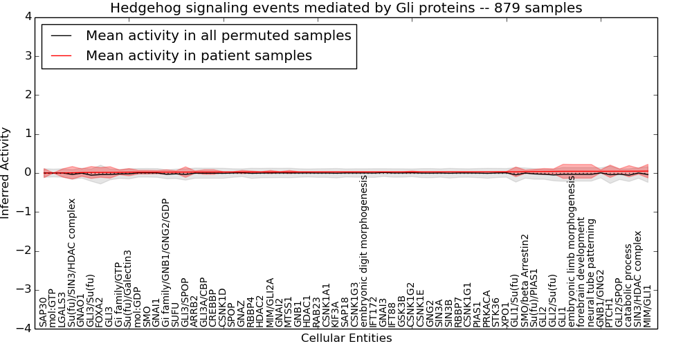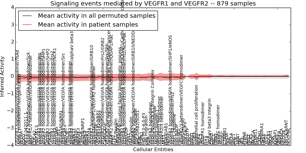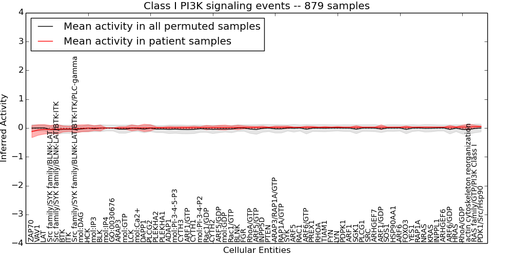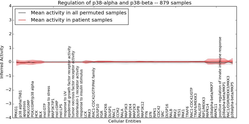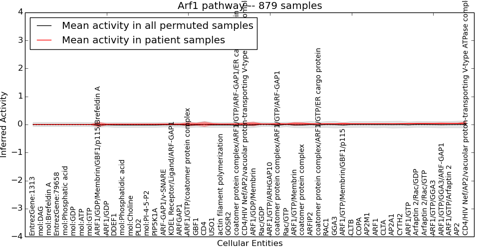 Figure S131. Get High-res Image This plot shows pathway concept perturbations across all samples against a permutation model. The concepts along the x-axis are sorted by lowest to highest mean activity for the real patient samples. Mean inferred activities are plotted along the y-axis as a colored band showing the average level and one standard deviation range. Real samples are shown in red and permuted samples in black.