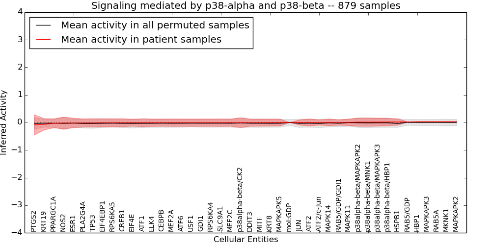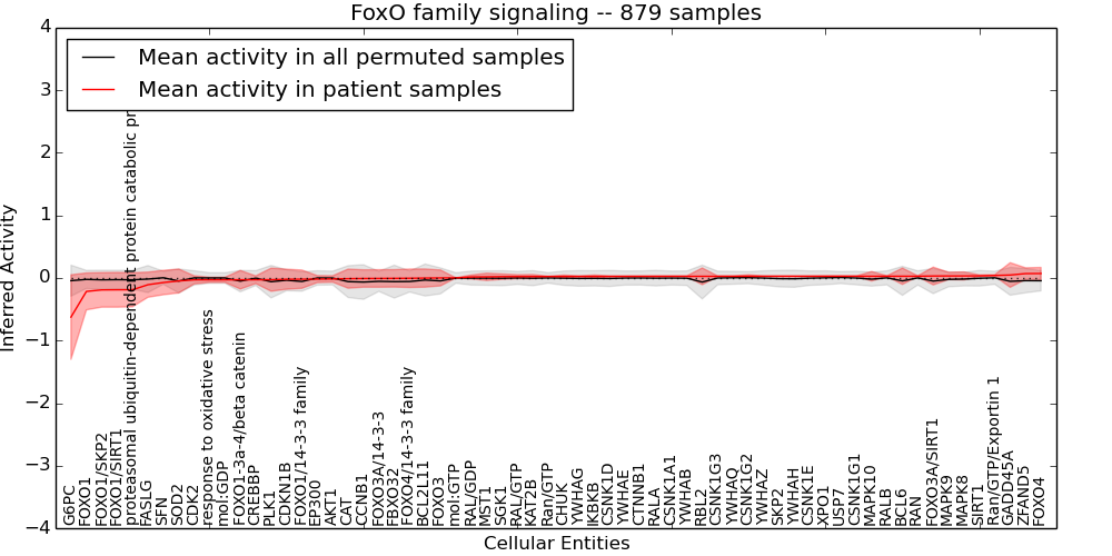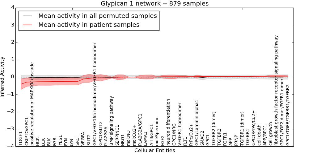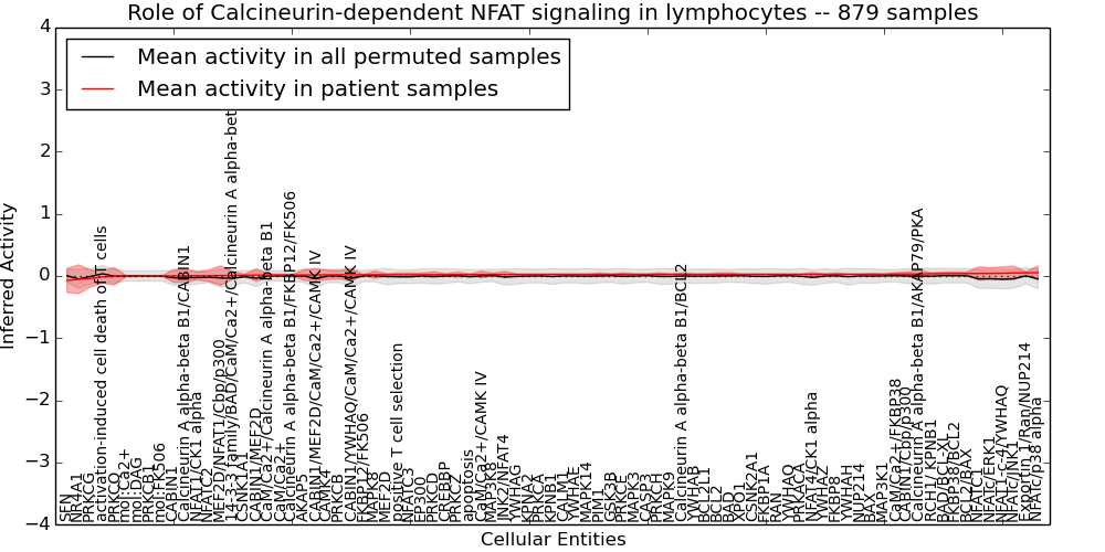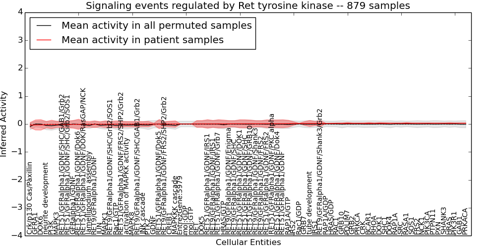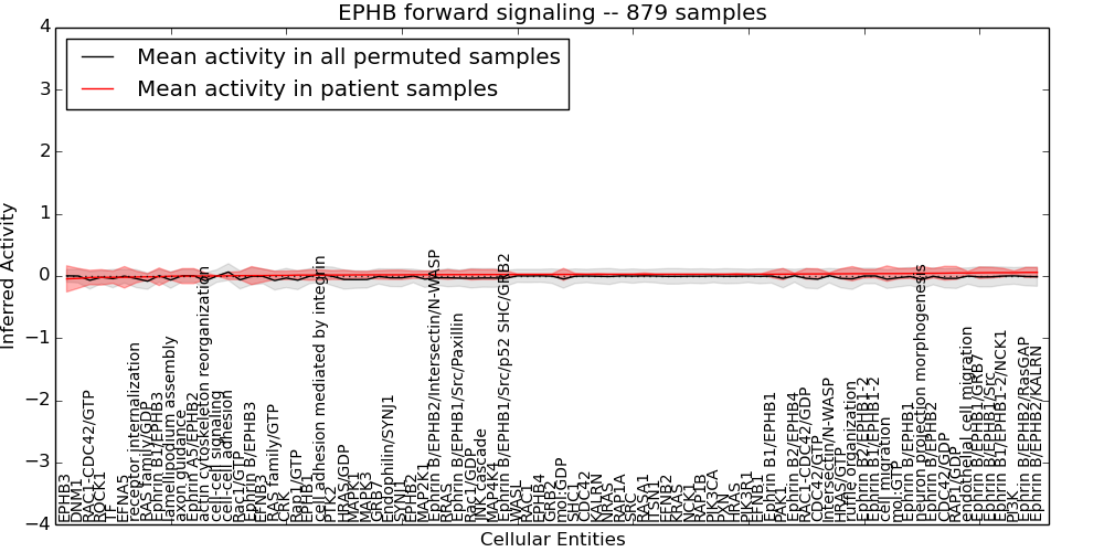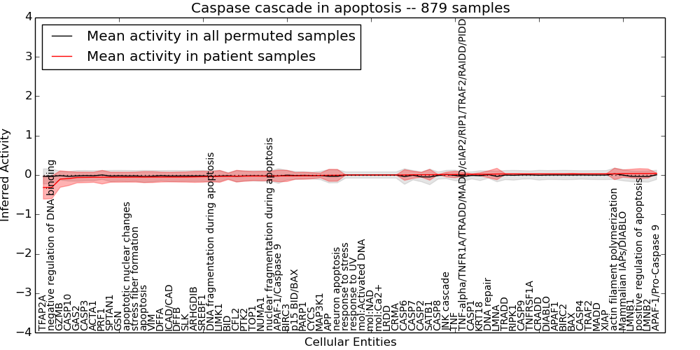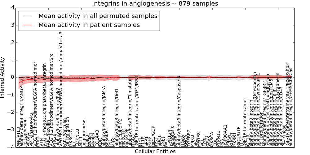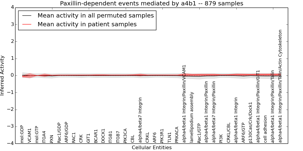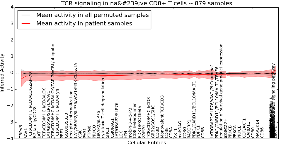 Figure S131. Get High-res Image This plot shows pathway concept perturbations across all samples against a permutation model. The concepts along the x-axis are sorted by lowest to highest mean activity for the real patient samples. Mean inferred activities are plotted along the y-axis as a colored band showing the average level and one standard deviation range. Real samples are shown in red and permuted samples in black.