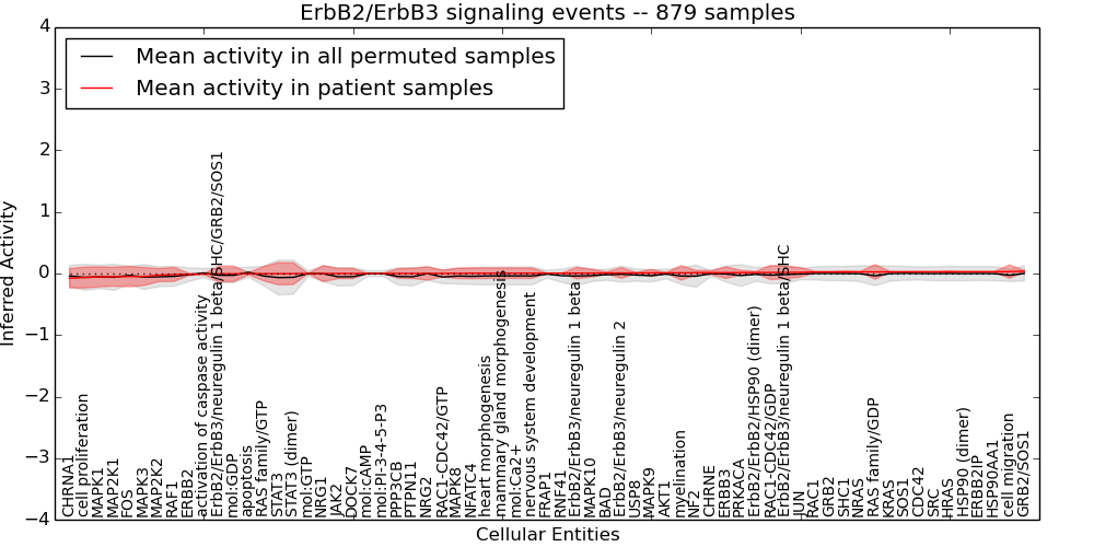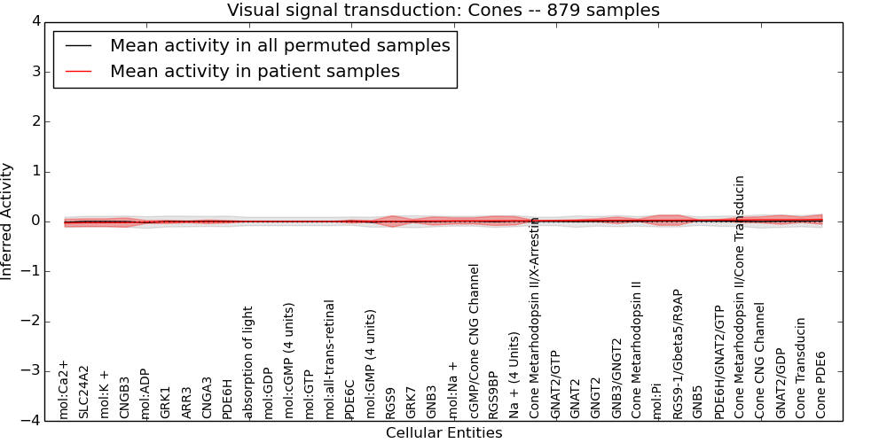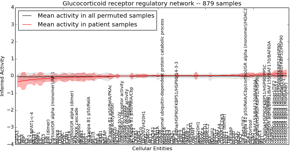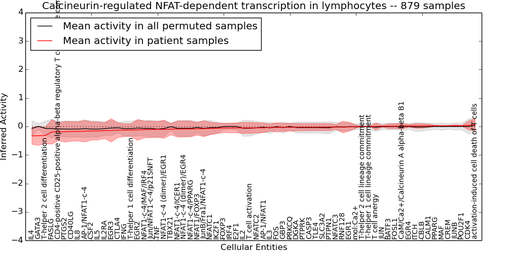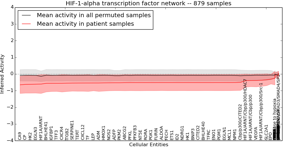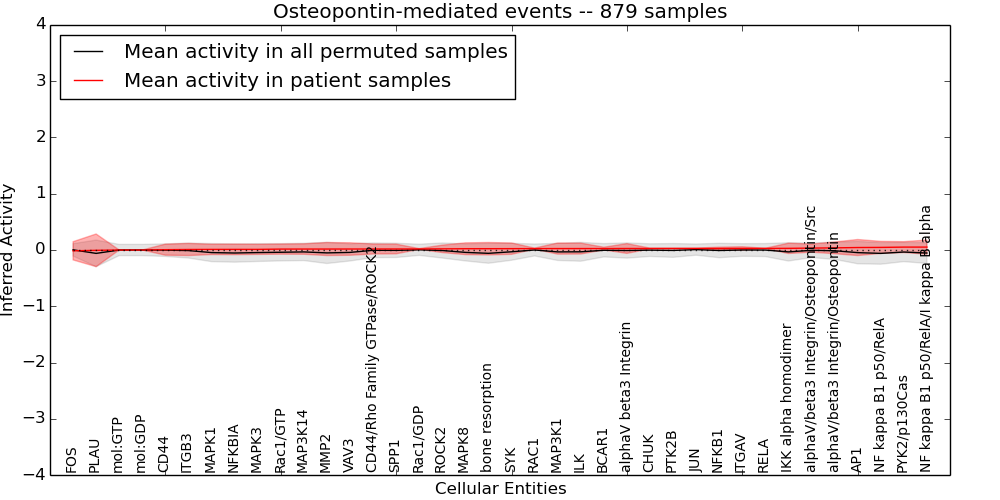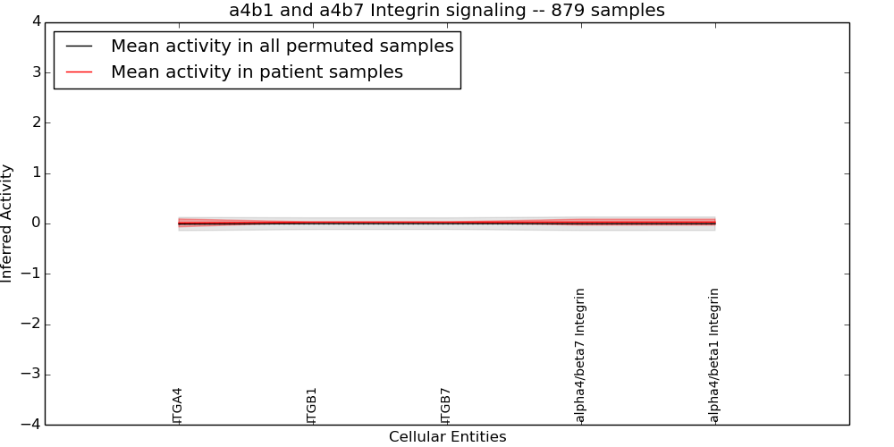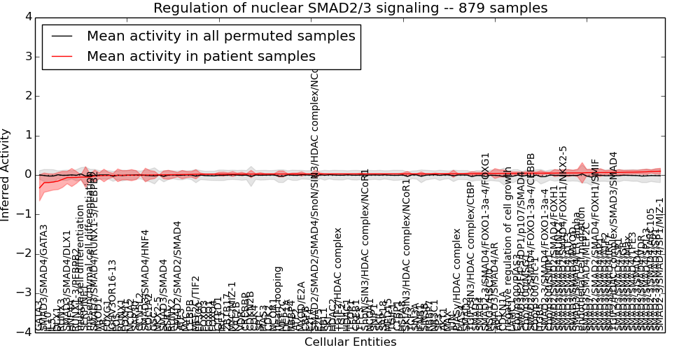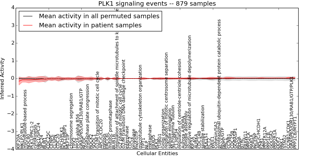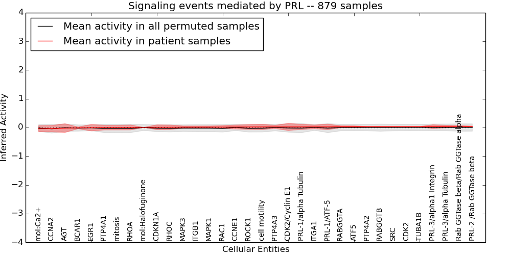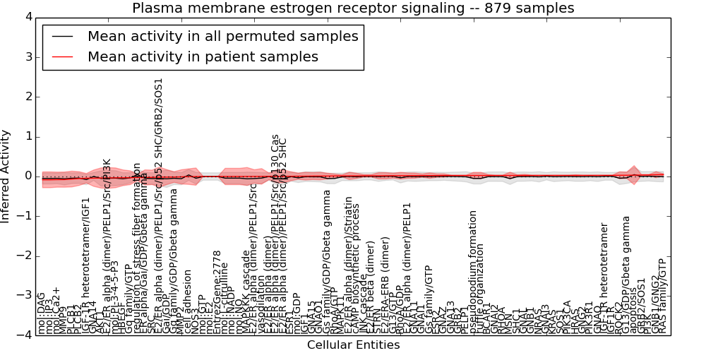 Figure S131. Get High-res Image This plot shows pathway concept perturbations across all samples against a permutation model. The concepts along the x-axis are sorted by lowest to highest mean activity for the real patient samples. Mean inferred activities are plotted along the y-axis as a colored band showing the average level and one standard deviation range. Real samples are shown in red and permuted samples in black.