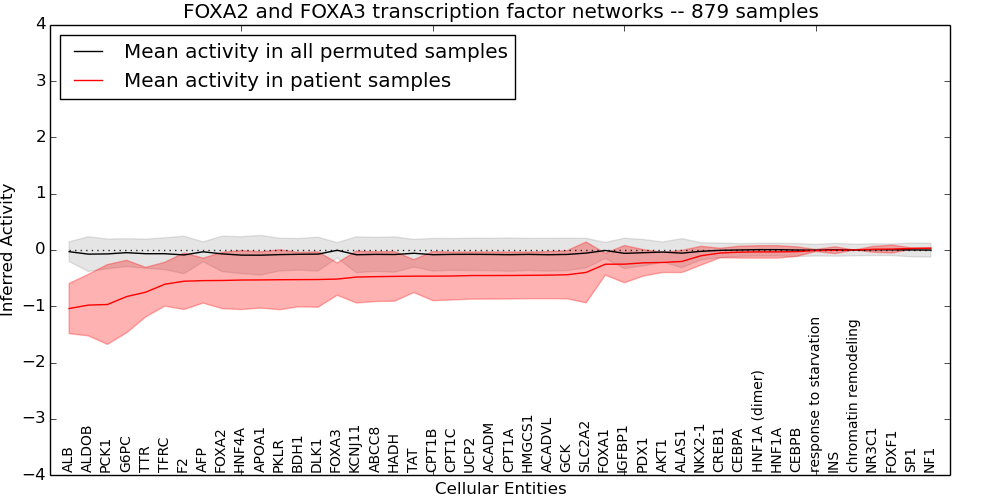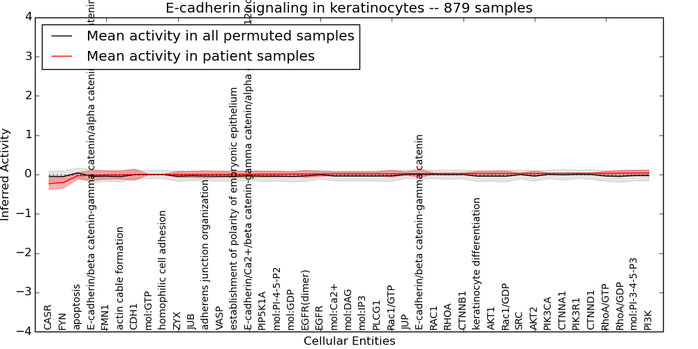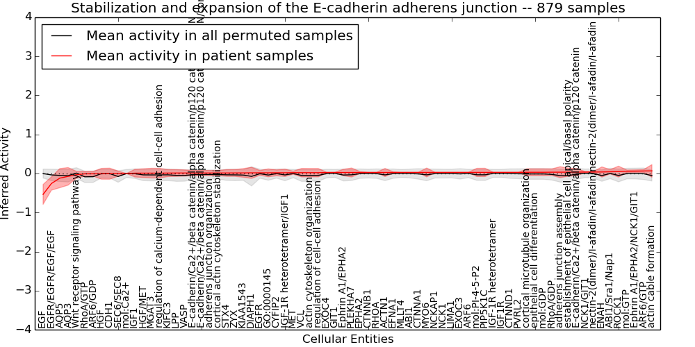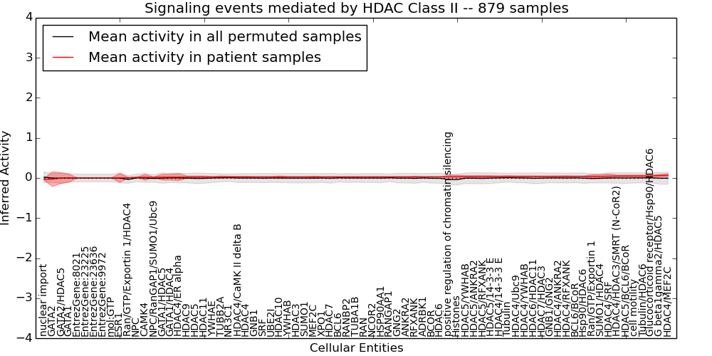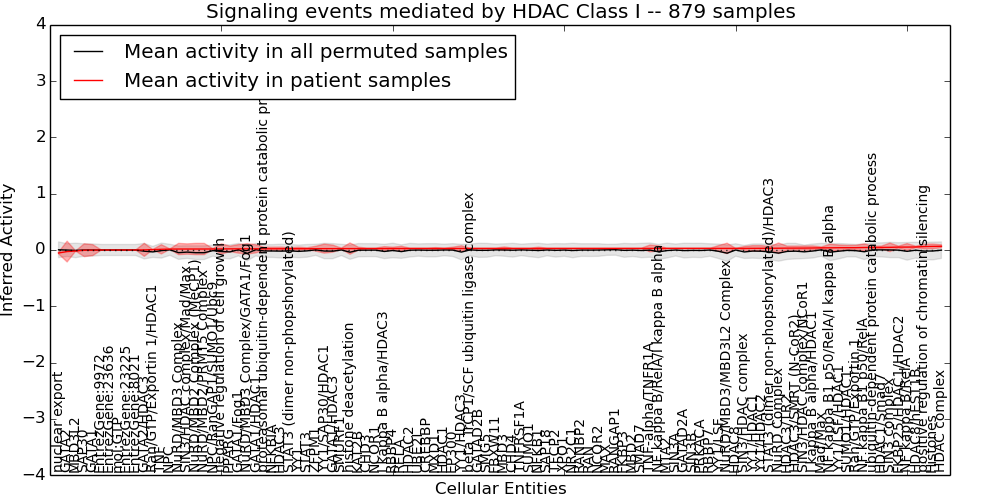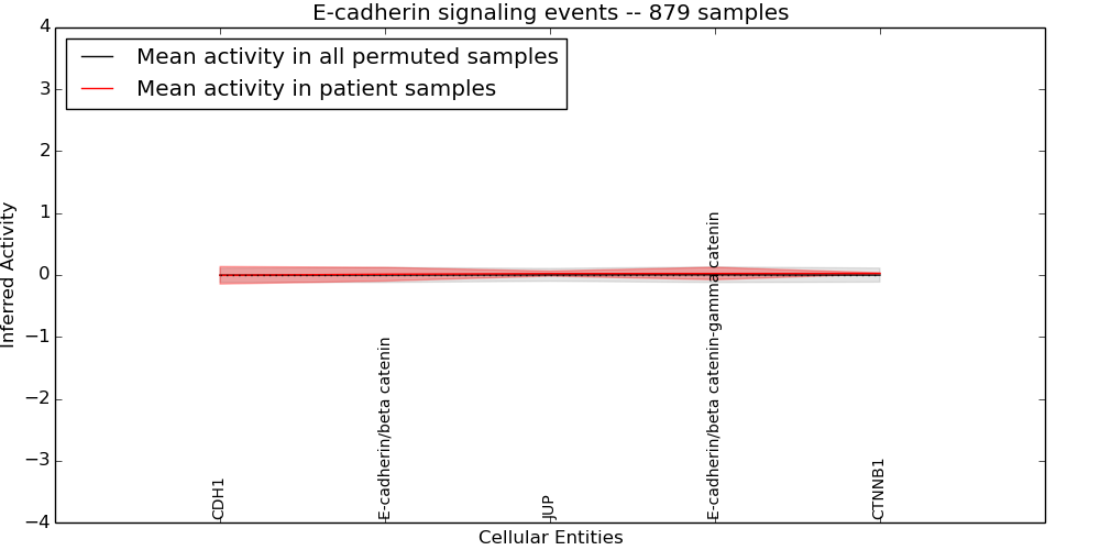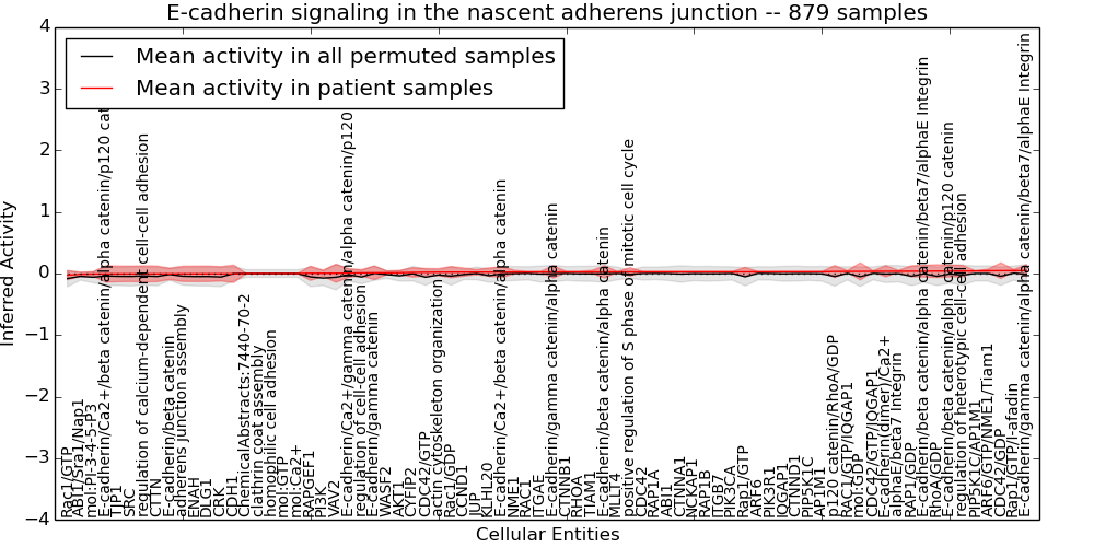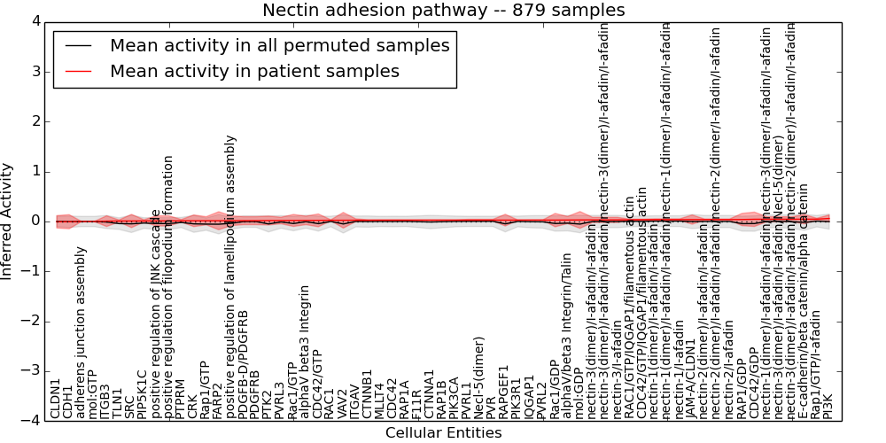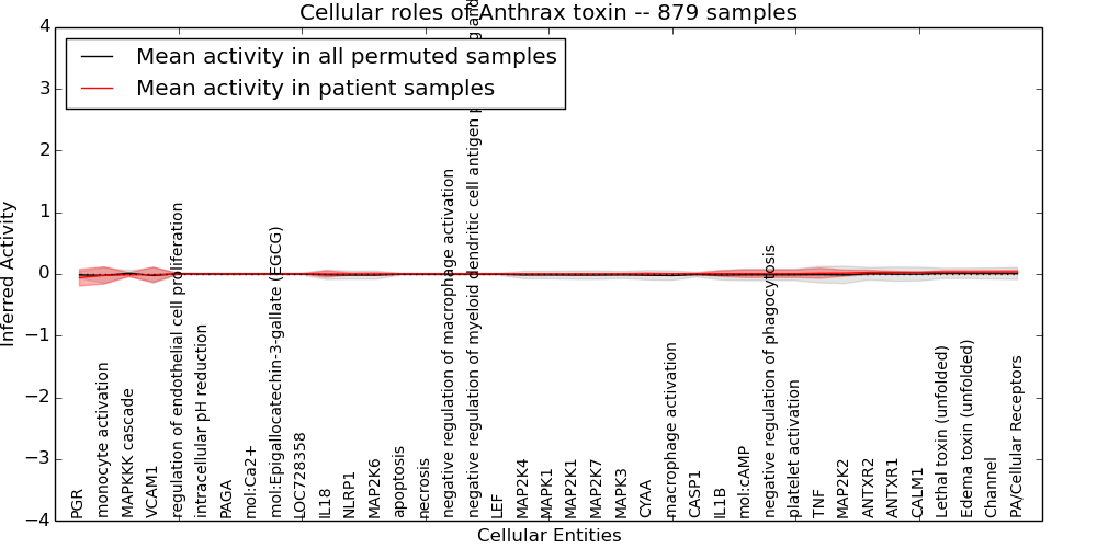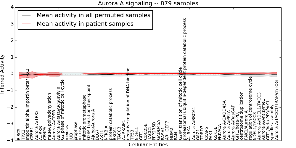 Figure S131. Get High-res Image This plot shows pathway concept perturbations across all samples against a permutation model. The concepts along the x-axis are sorted by lowest to highest mean activity for the real patient samples. Mean inferred activities are plotted along the y-axis as a colored band showing the average level and one standard deviation range. Real samples are shown in red and permuted samples in black.