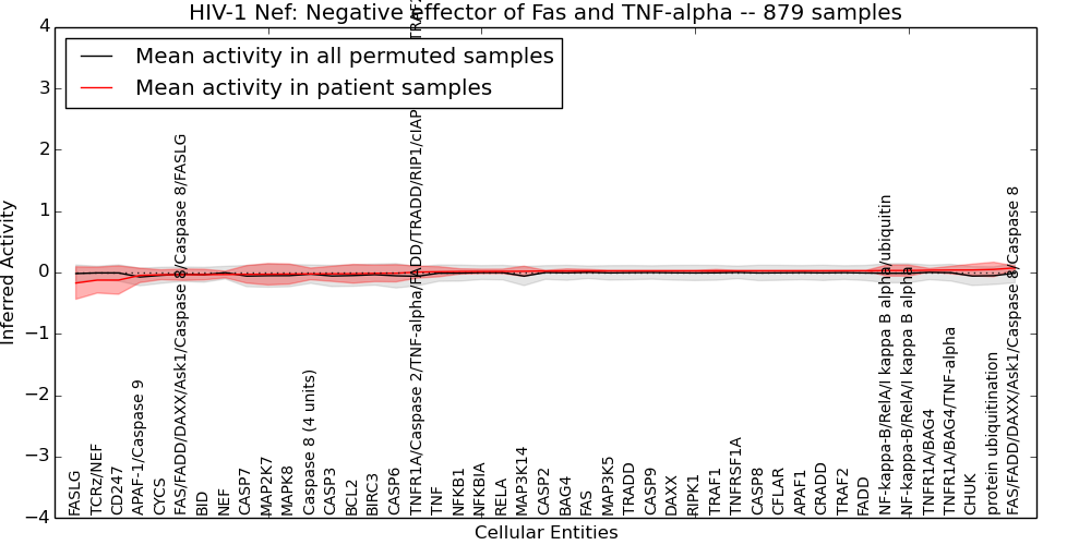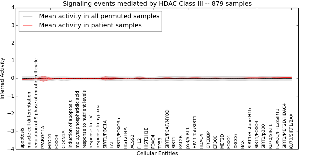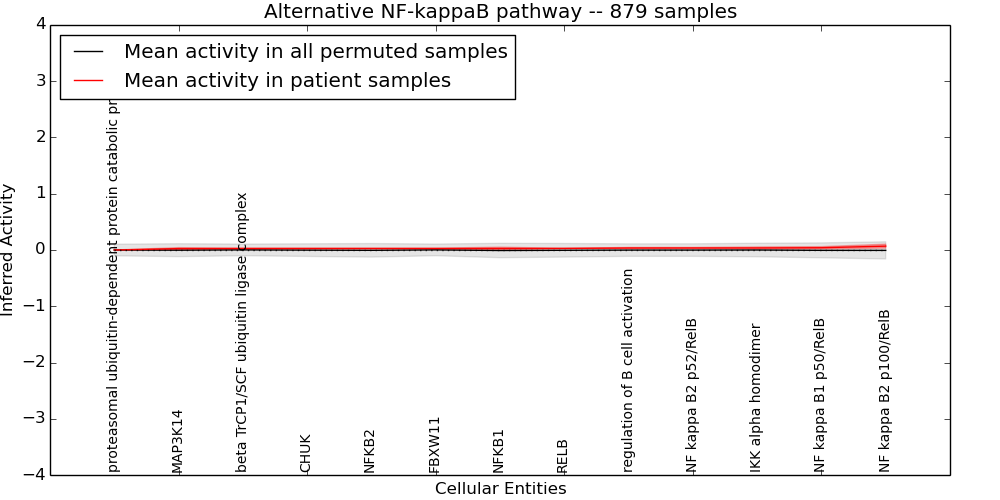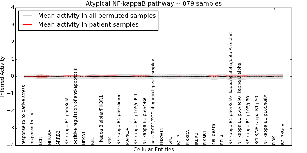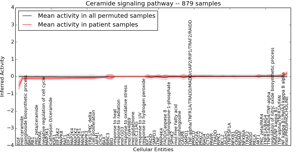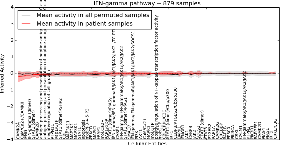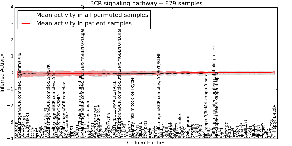 Figure S130. Get High-res Image This plot shows pathway concept perturbations across all samples against a permutation model. The concepts along the x-axis are sorted by lowest to highest mean activity for the real patient samples. Mean inferred activities are plotted along the y-axis as a colored band showing the average level and one standard deviation range. Real samples are shown in red and permuted samples in black.
