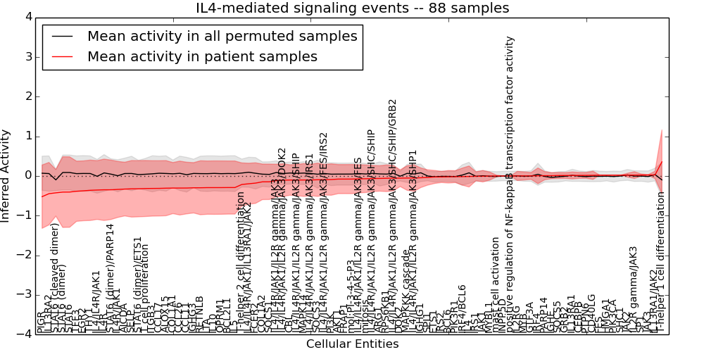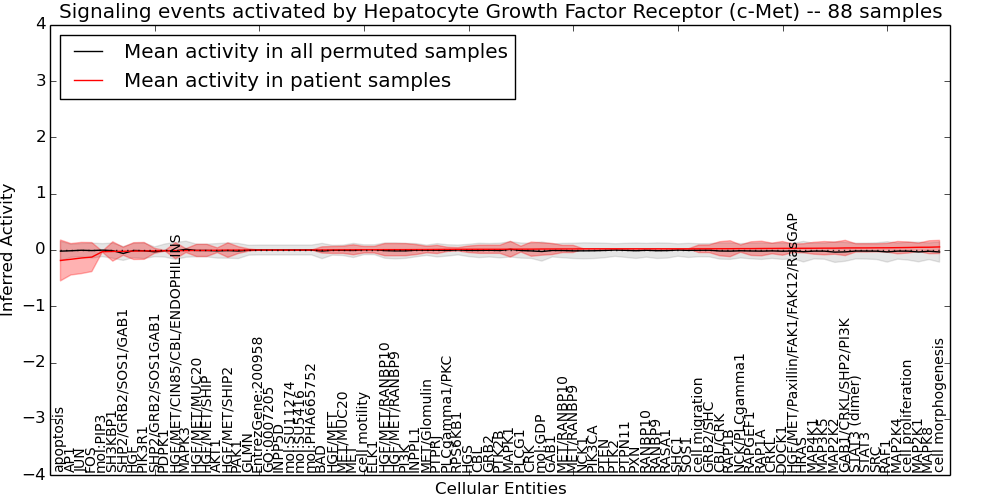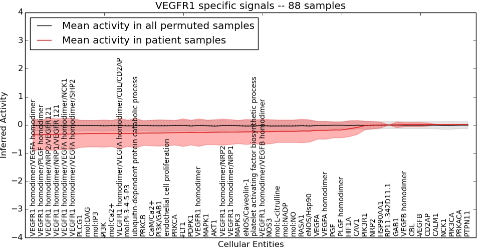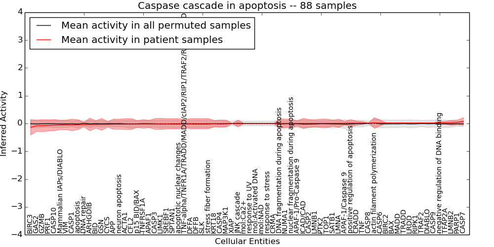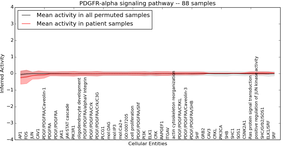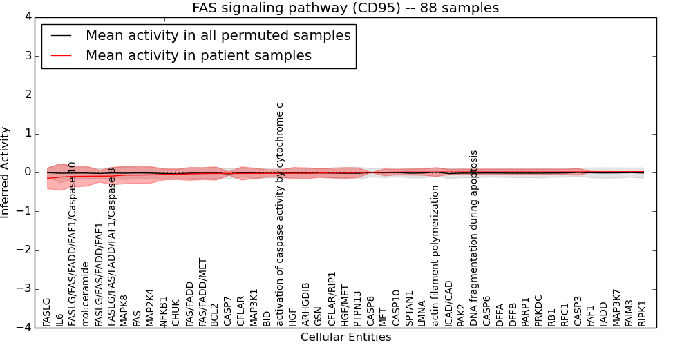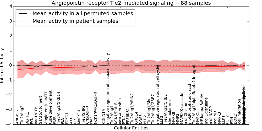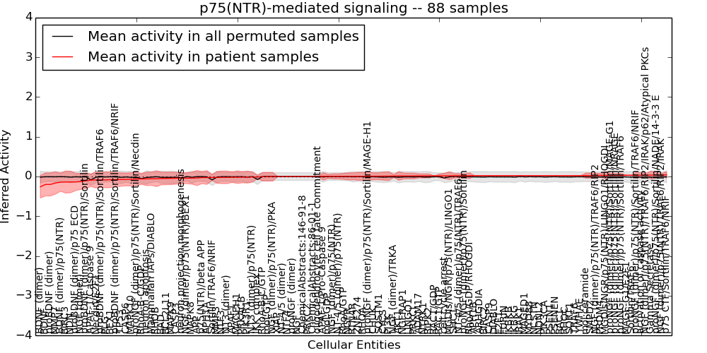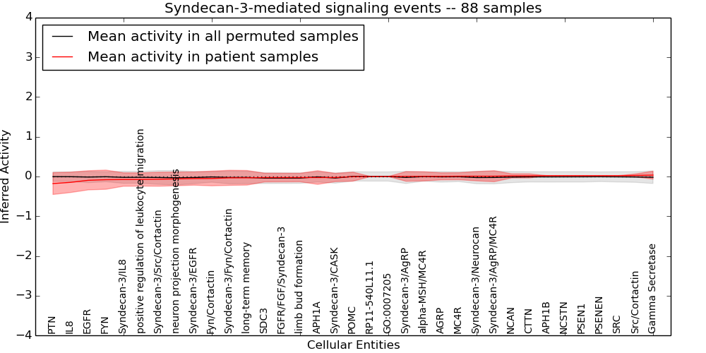 Figure S131. Get High-res Image This plot shows pathway concept perturbations across all samples against a permutation model. The concepts along the x-axis are sorted by lowest to highest mean activity for the real patient samples. Mean inferred activities are plotted along the y-axis as a colored band showing the average level and one standard deviation range. Real samples are shown in red and permuted samples in black.