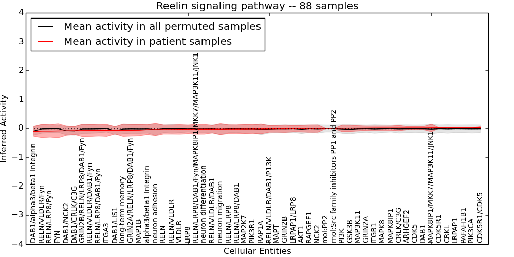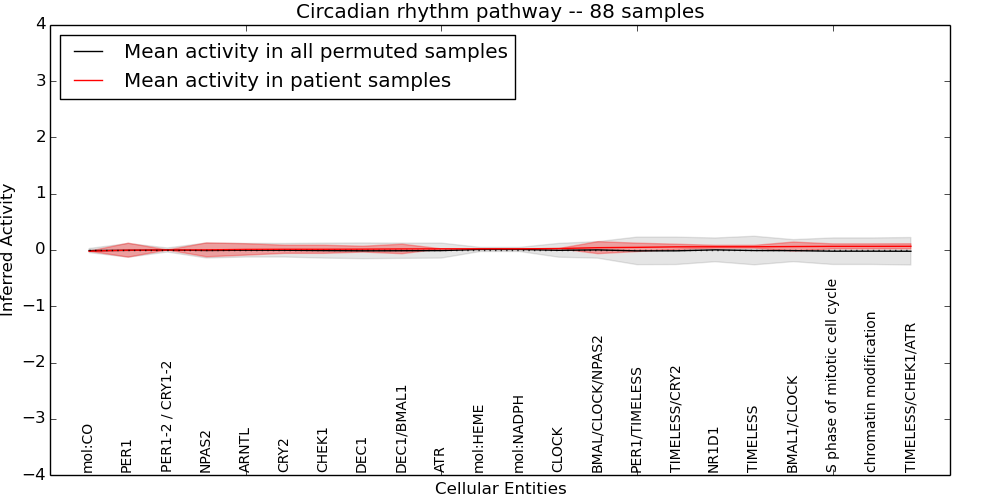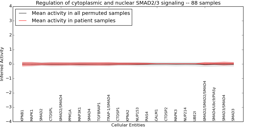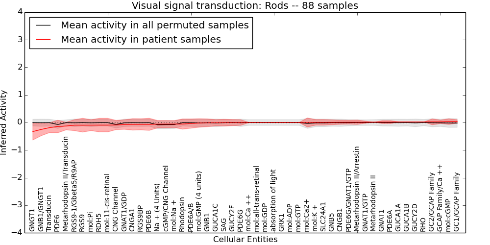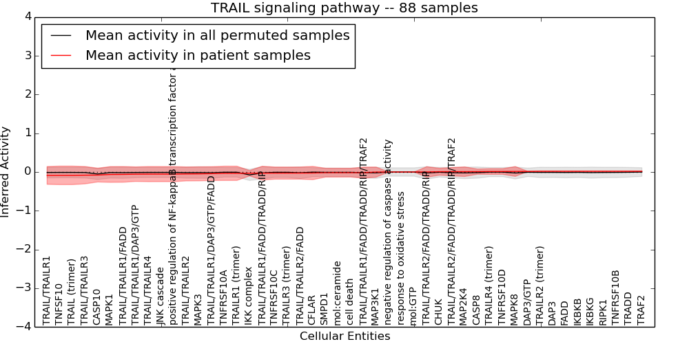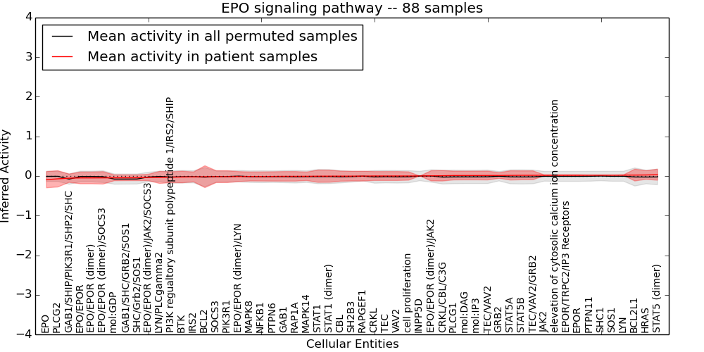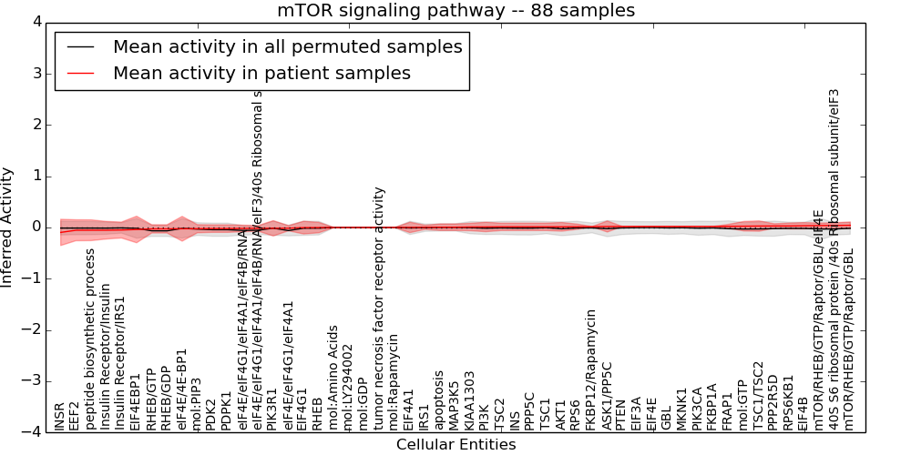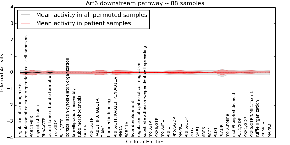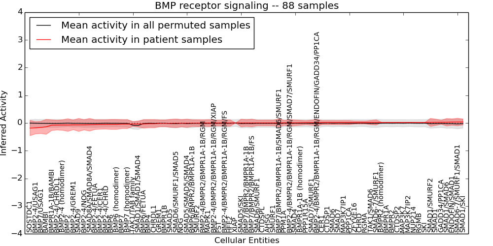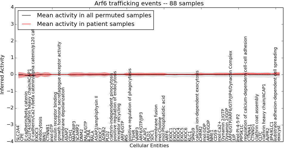 Figure S131. Get High-res Image This plot shows pathway concept perturbations across all samples against a permutation model. The concepts along the x-axis are sorted by lowest to highest mean activity for the real patient samples. Mean inferred activities are plotted along the y-axis as a colored band showing the average level and one standard deviation range. Real samples are shown in red and permuted samples in black.
