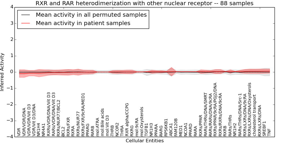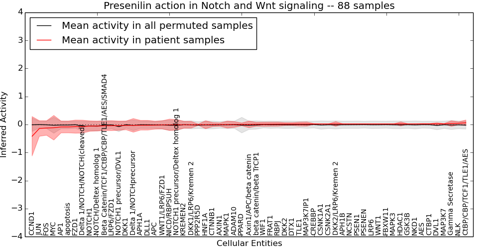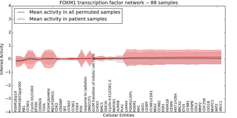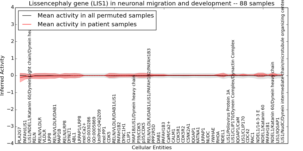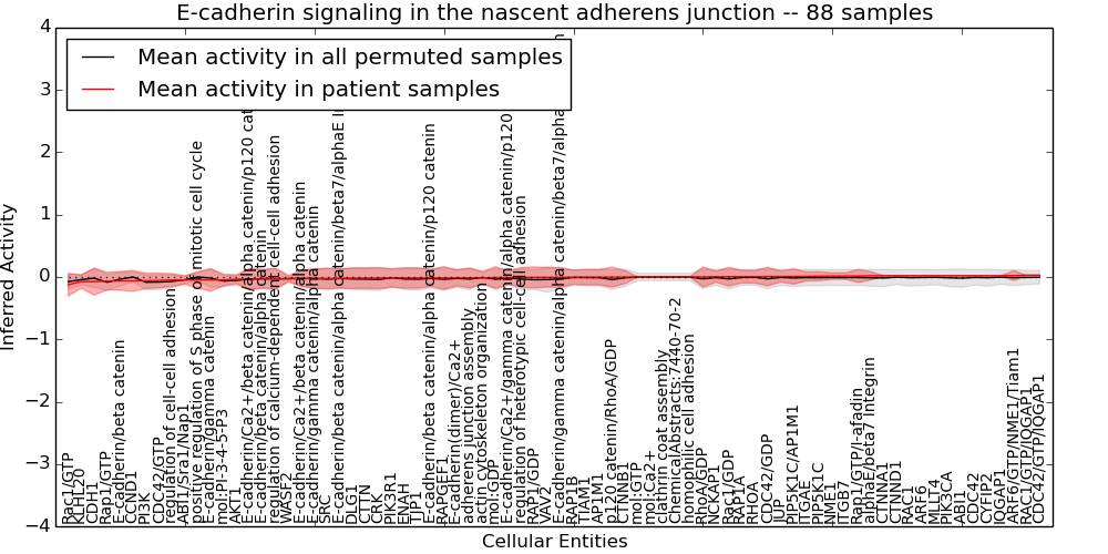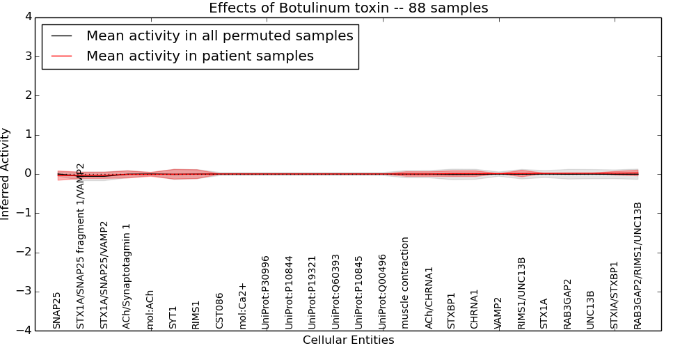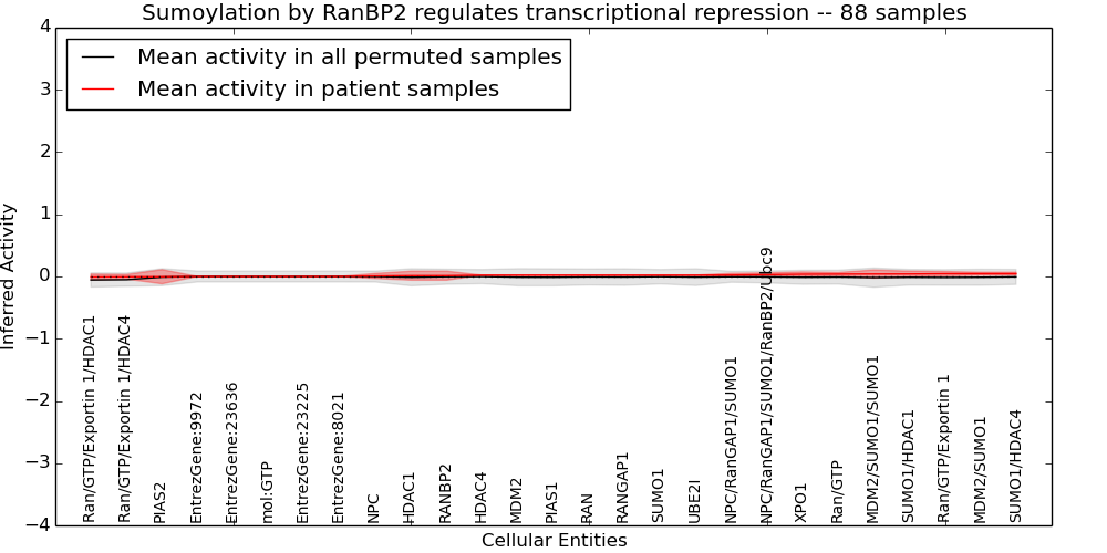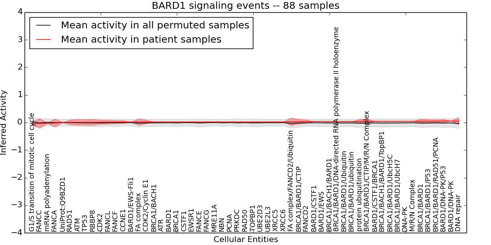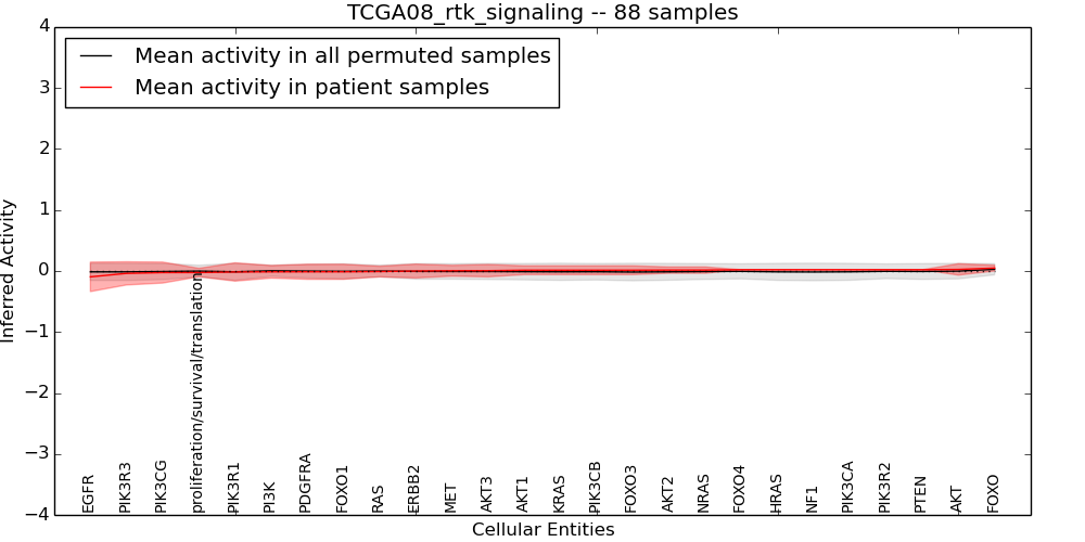 Figure S131. Get High-res Image This plot shows pathway concept perturbations across all samples against a permutation model. The concepts along the x-axis are sorted by lowest to highest mean activity for the real patient samples. Mean inferred activities are plotted along the y-axis as a colored band showing the average level and one standard deviation range. Real samples are shown in red and permuted samples in black.