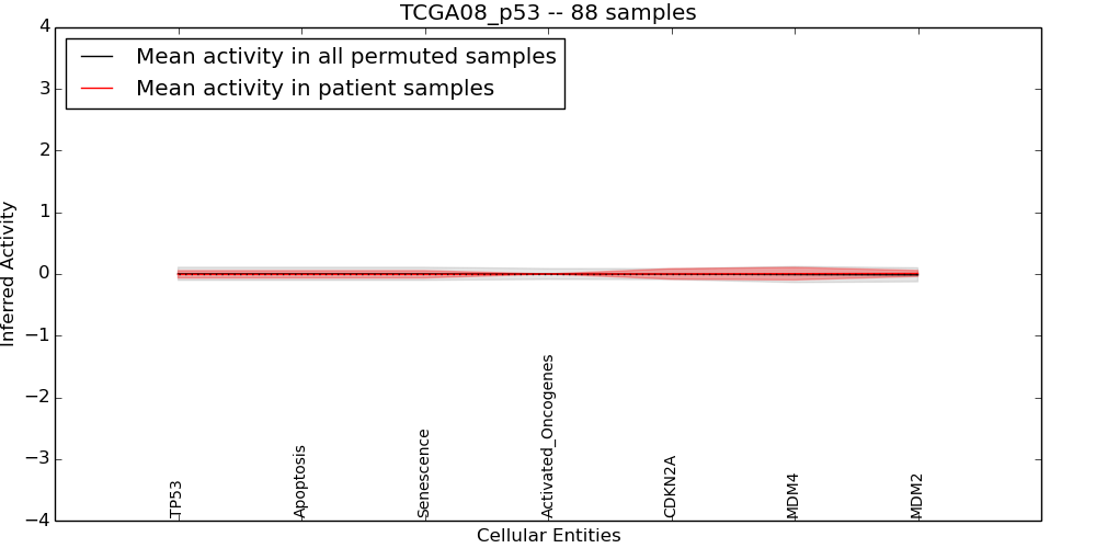 The significance of the IPL obtained for each concept in each patient sample is assessed using a permutation analysis. Importantly, the permutation analysis preserves data tuples so as to preserve any implicit correlations between the different data modalities. For example, genes that are deleted have concomitantly lower expression levels. Preserving the copy number and expression pairs therefore retains this data property. The simulation therefore makes "null samples" by permuting data tuples across all of the genes in the genome so that each gene in a null sample is associated with a random tuple of another gene with equal probability. This approach has the added benefit of preserving the pathway structure so that every observed IPL can be compared to a distribution of random IPLs derived from exactly the same interaction context. PARADIGM inferences are then obtained for 1000 "null" patients and serve as a background distribution to contrast the observed IPLs against. Pathway concepts are excluded from further analysis if they did not obtain a minimum IPL of 0.5 in any patient sample both observed or simulated.