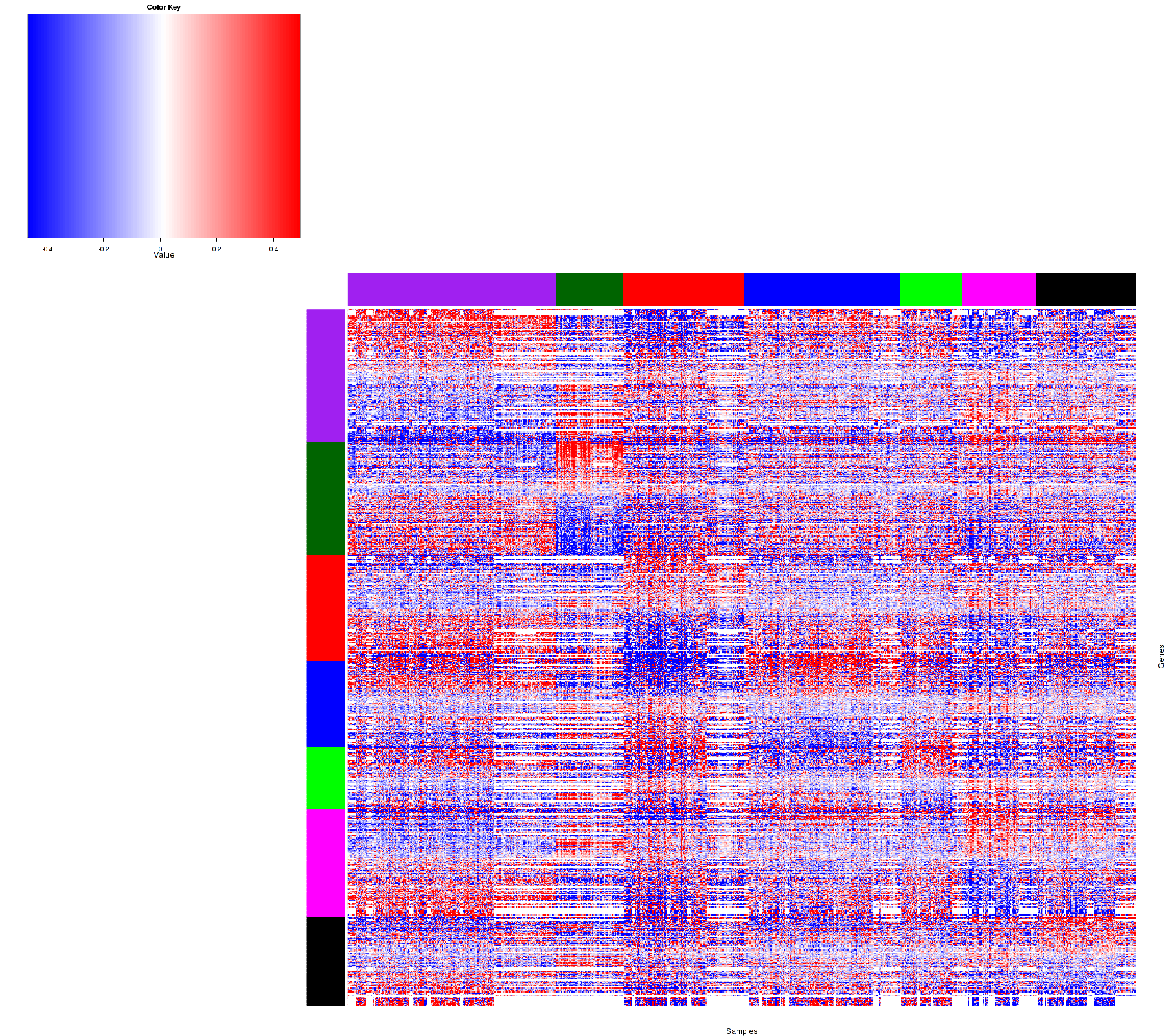 Figure 1. Get High-res Image Samples were separated into 7 clusters. Shown are 756 samples and 895 marker proteins. The color bar of the row indicates the marker proteins for the corresponding cluster.