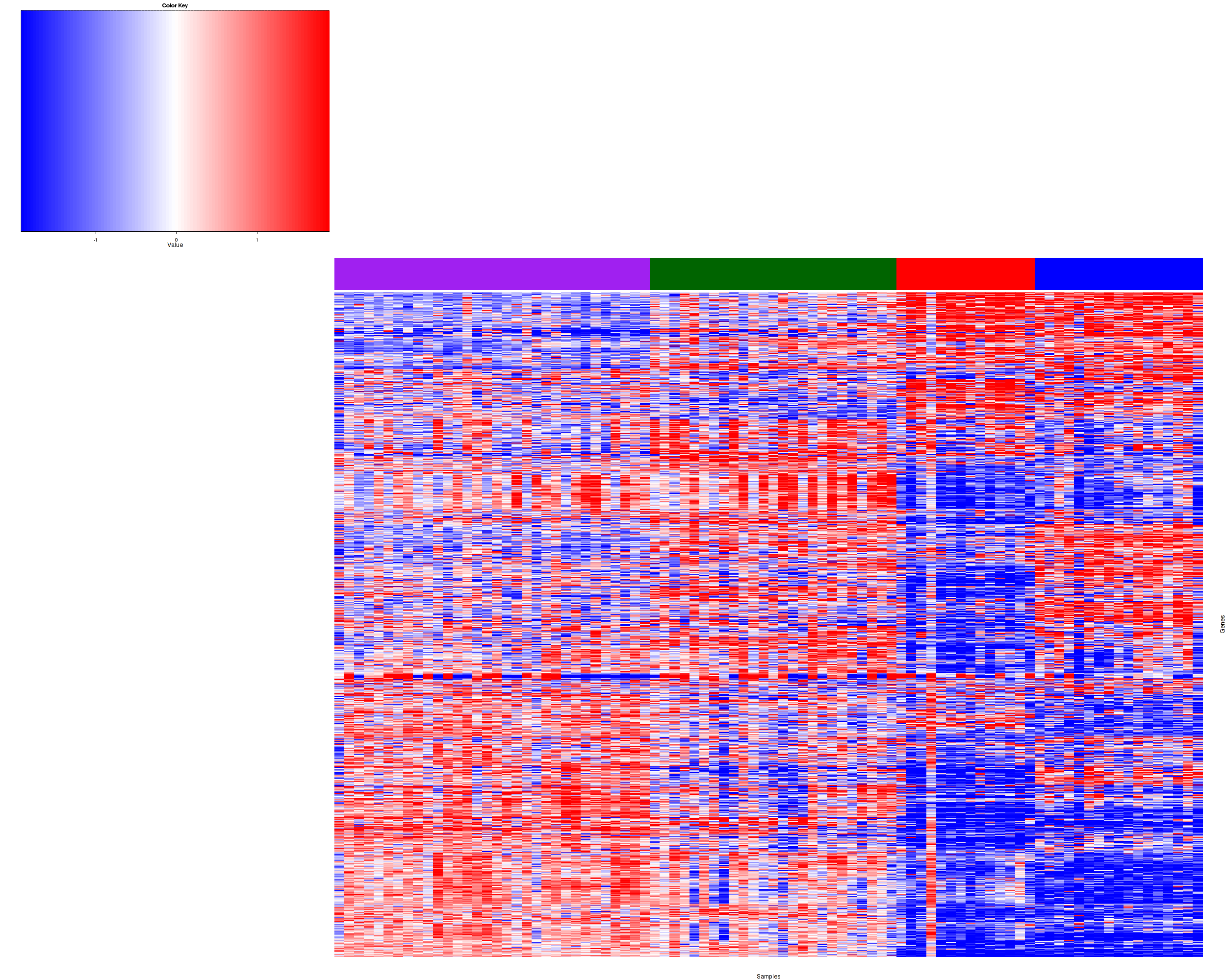 Figure 1. Get High-res Image Samples were separated into 4 clusters. Shown are 88 samples and 1200 marker genes. The color bar of the row indicates the marker genes for the corresponding cluster.