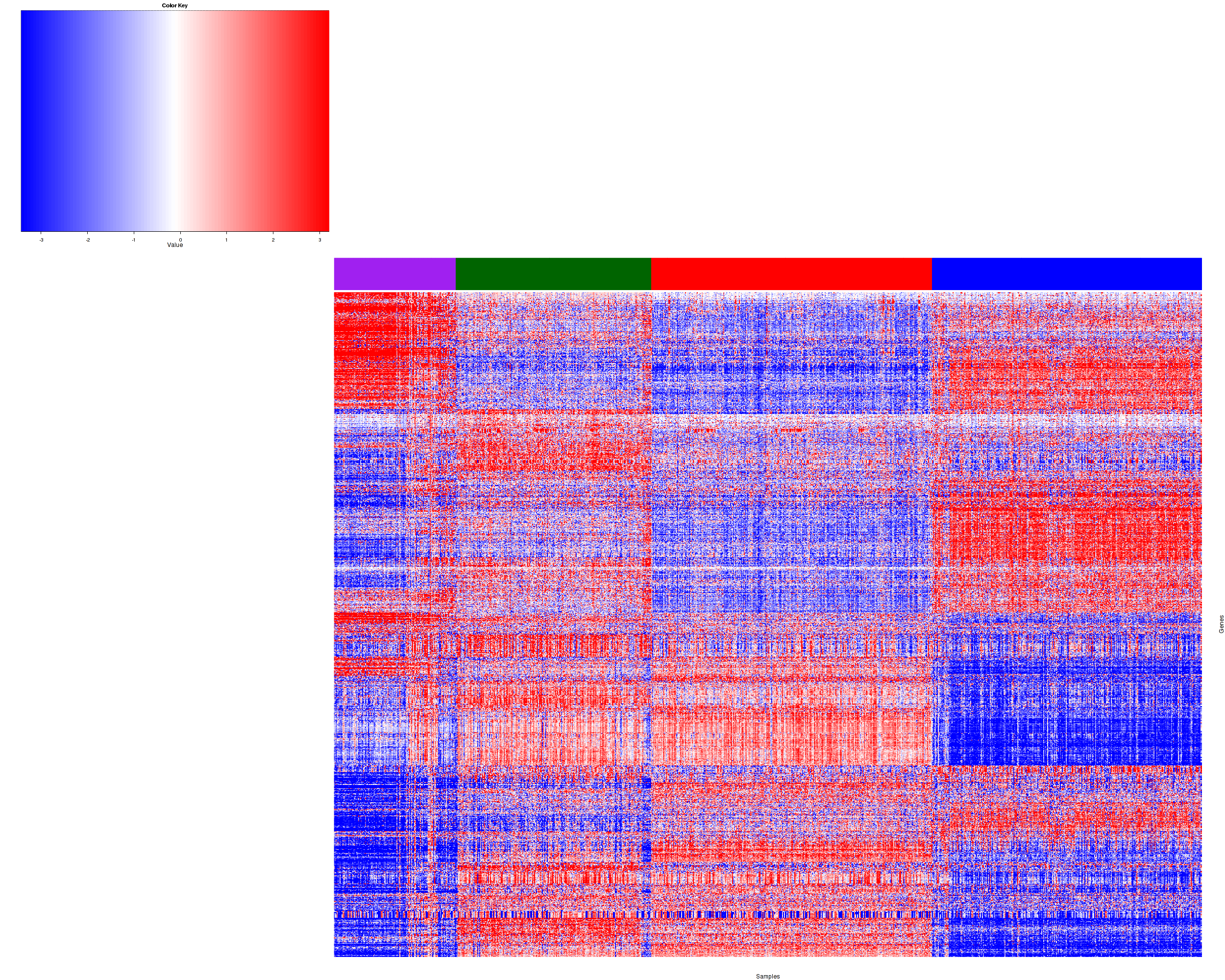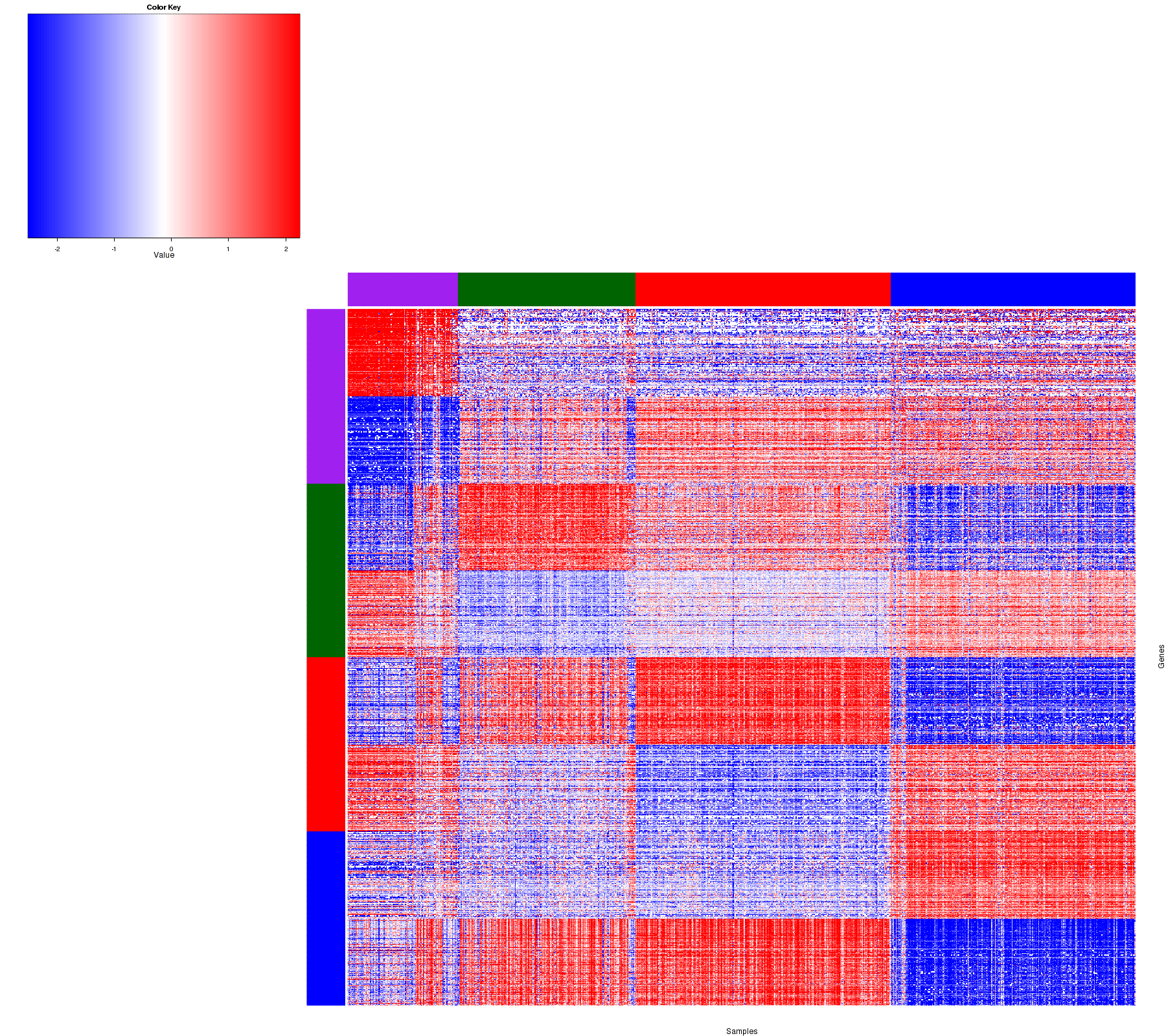 Figure 1. Get High-res Image Samples were separated into 4 clusters. Shown are 889 samples and 1200 marker genes. The color bar of the row indicates the marker genes for the corresponding cluster.
