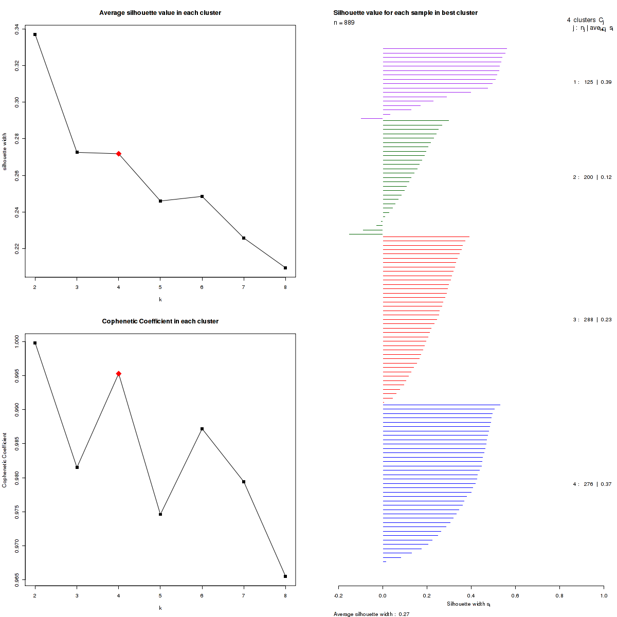 The most robust consensus NMF clustering of 889 samples using the 1500 most variable genes was identified for k = 4 clusters. We computed the clustering for k = 2 to k = 10 and uused the cophenetic correlation coefficient and the average silhouette width calculation to determine the robust clusters.