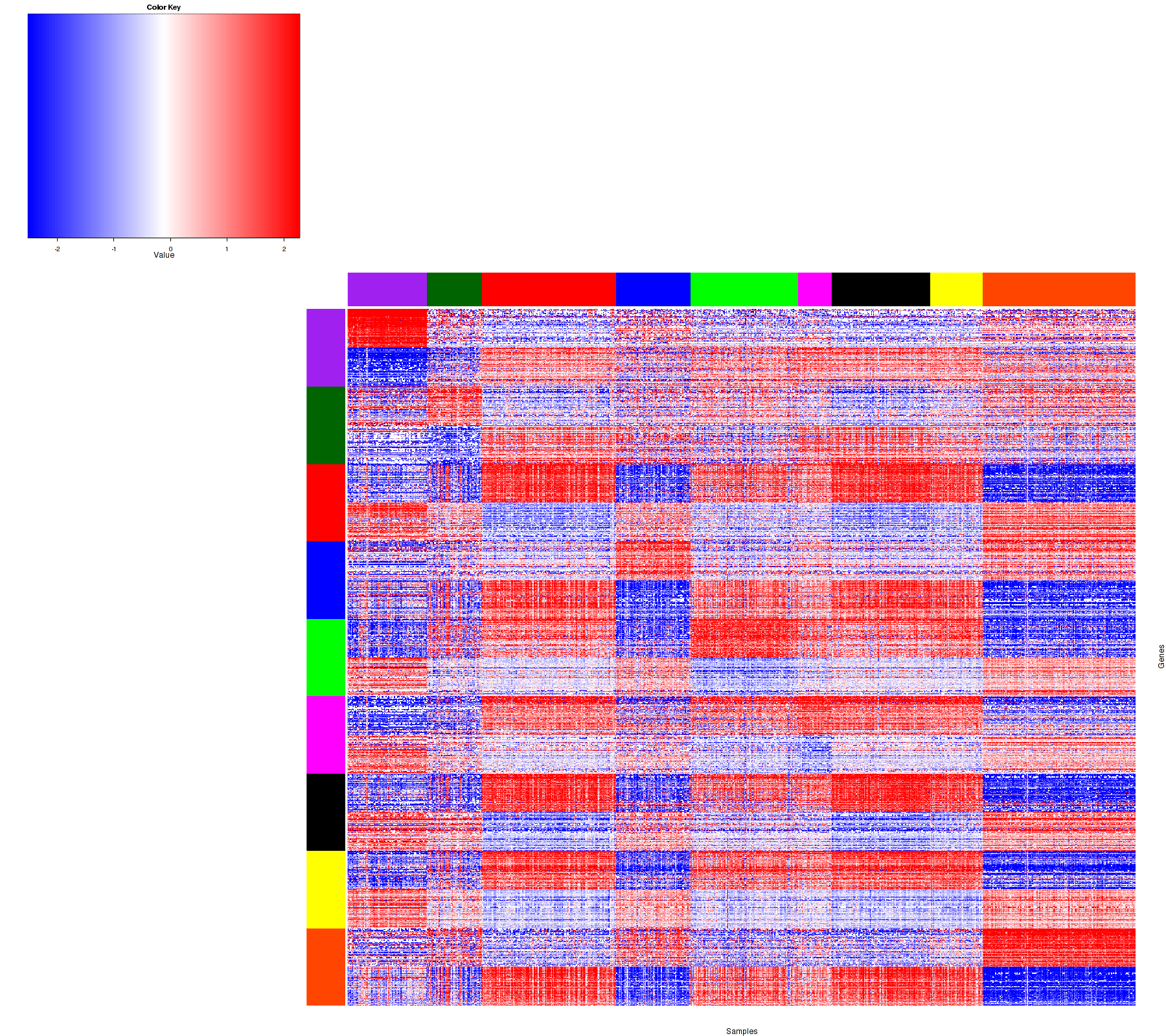 Figure 1. Get High-res Image Samples were separated into 9 clusters. Shown are 889 samples and 2700 marker genes. The color bar of the row indicates the marker genes for the corresponding cluster.