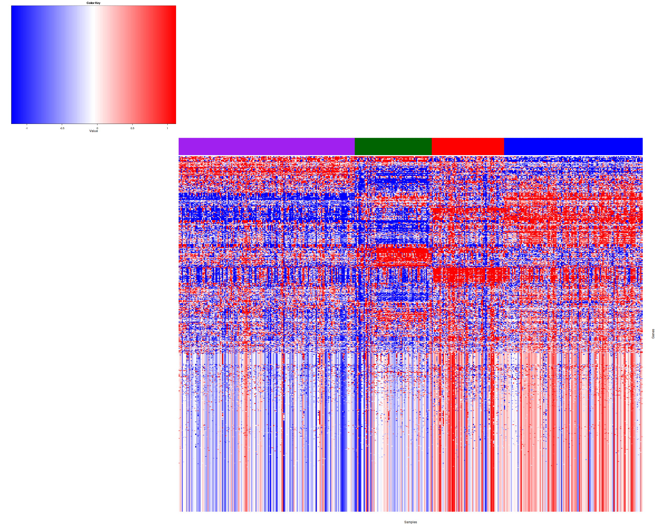 Figure 1. Get High-res Image Samples were separated into 4 clusters. Shown are 416 samples and 1307 marker miRs. The color bar of the row indicates the marker miRs for the corresponding cluster.