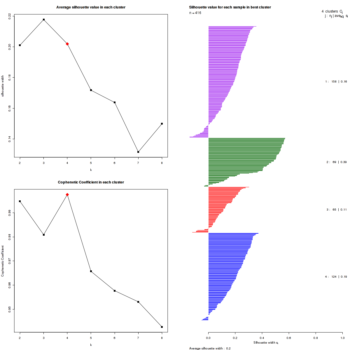 Figure 3. Get High-res Image The silhouette width was calculated for each sample and each value of k. The left upper panel shows the average silhouette width across all samples for each tested k (left upper panel). The left lower panel shows the Cophenetic Correlation Coefficients for each tested k. The right panel shows assignments of clusters to samples and the silhouette width of each sample for the most robust clustering.