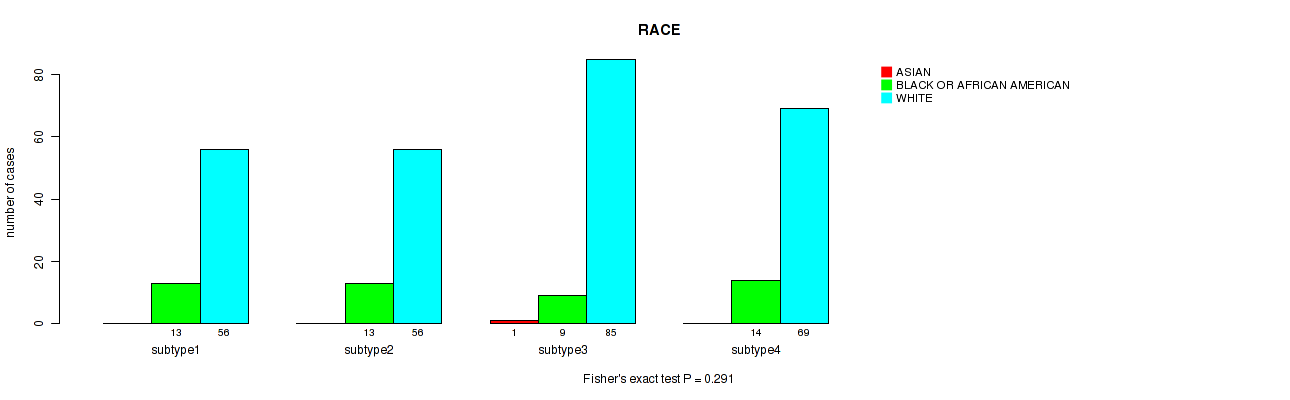 4 subtypes identified in current cancer cohort by 'MIRseq Mature CNMF subtypes'. These subtypes correlate to 'Time to Death', 'PATHOLOGIC_STAGE', 'PATHOLOGY_T_STAGE', 'PATHOLOGY_M_STAGE', and 'RACE'.