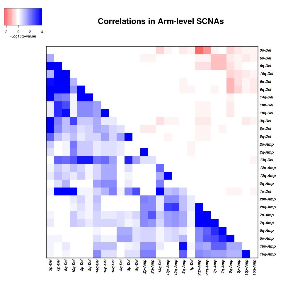 Figure 1. Get High-res Image Co-occurring and mutually-exclusive pairs for copy number variations of arm level events. Blue means two events are co-occurring and red means two events are mutually-exclusive.