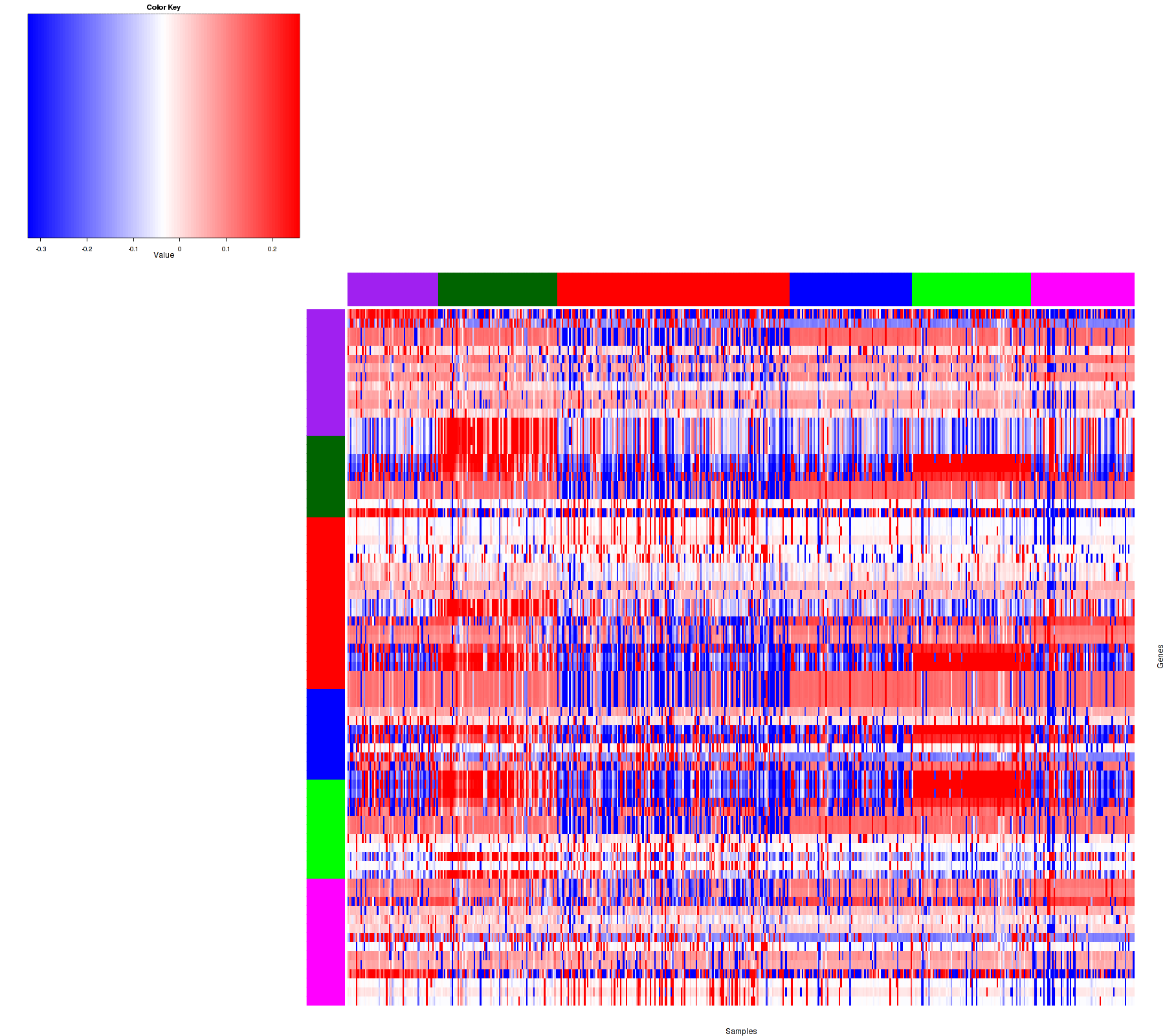 Figure 1. Get High-res Image Samples were separated into 6 clusters. Shown are 528 samples and 77 marker focal events. The color bar of the row indicates the marker focal events for the corresponding cluster.