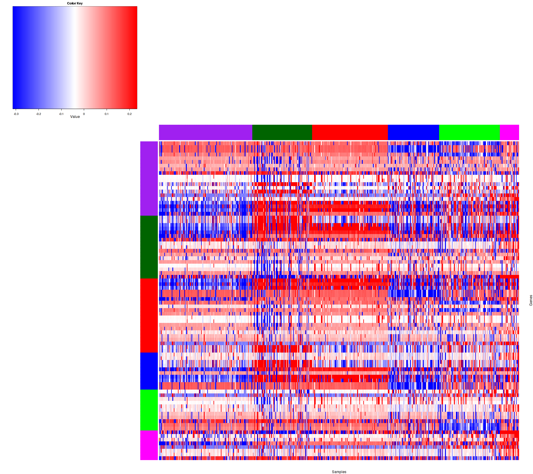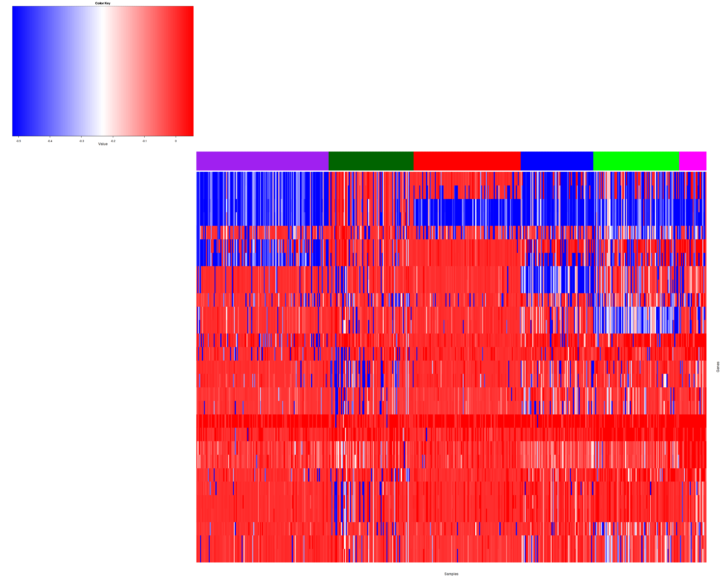 Figure 1. Get High-res Image Samples were separated into 6 clusters. Shown are 528 samples and 86 marker focal events. The color bar of the row indicates the marker focal events for the corresponding cluster.