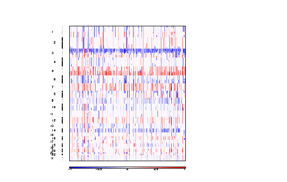 A table of chromosome arm amplification levels for each sample. Each row is a chromosome arm, and each column a sample. The data are in units of absolute copy number -2.