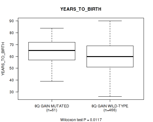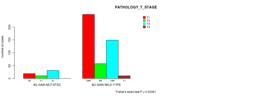 8q gain cnv correlated to 'YEARS_TO_BIRTH', 'PATHOLOGIC_STAGE', and 'PATHOLOGY_T_STAGE'.