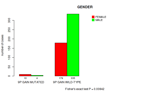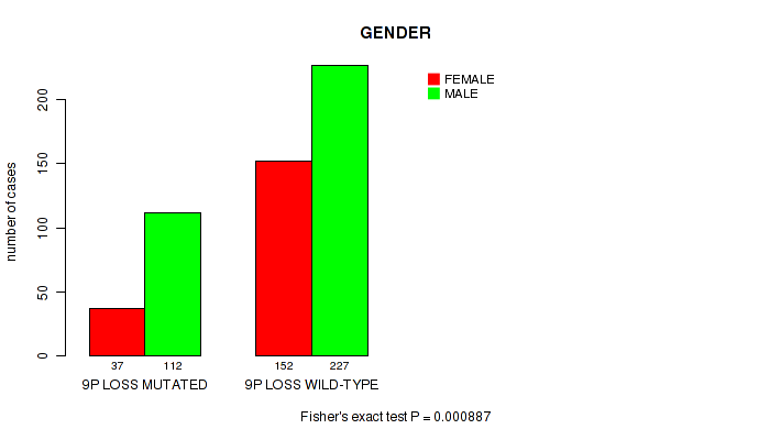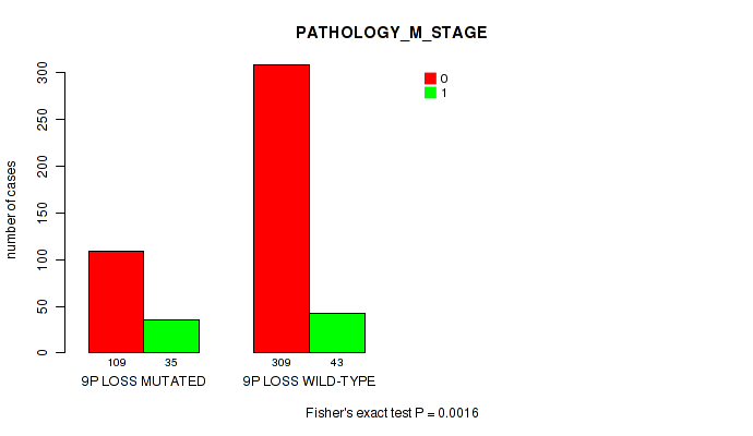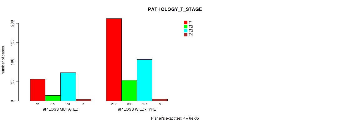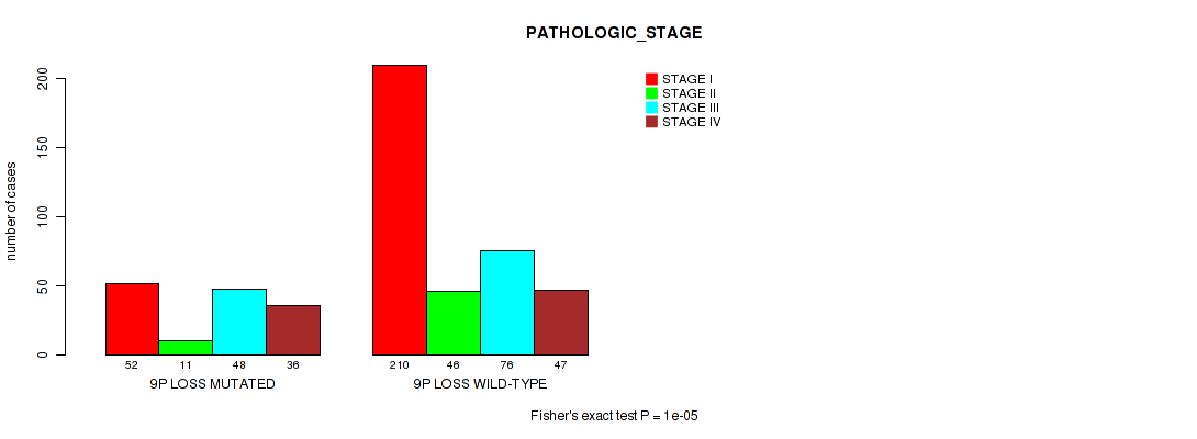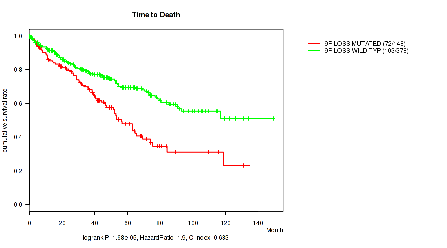 9p loss cnv correlated to 'Time to Death', 'PATHOLOGIC_STAGE', 'PATHOLOGY_T_STAGE', 'PATHOLOGY_M_STAGE', and 'GENDER'.