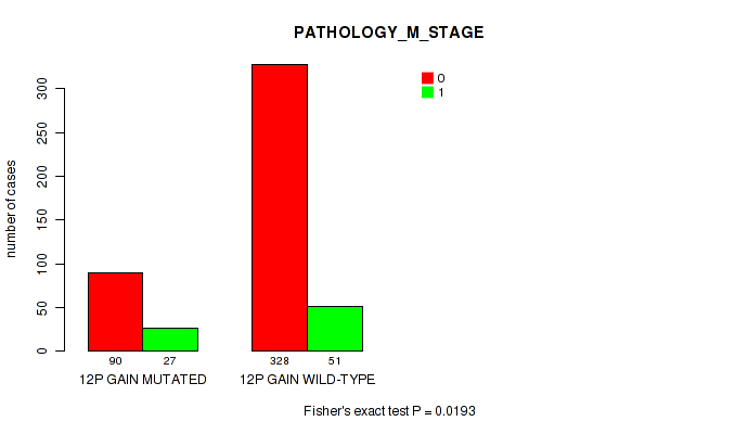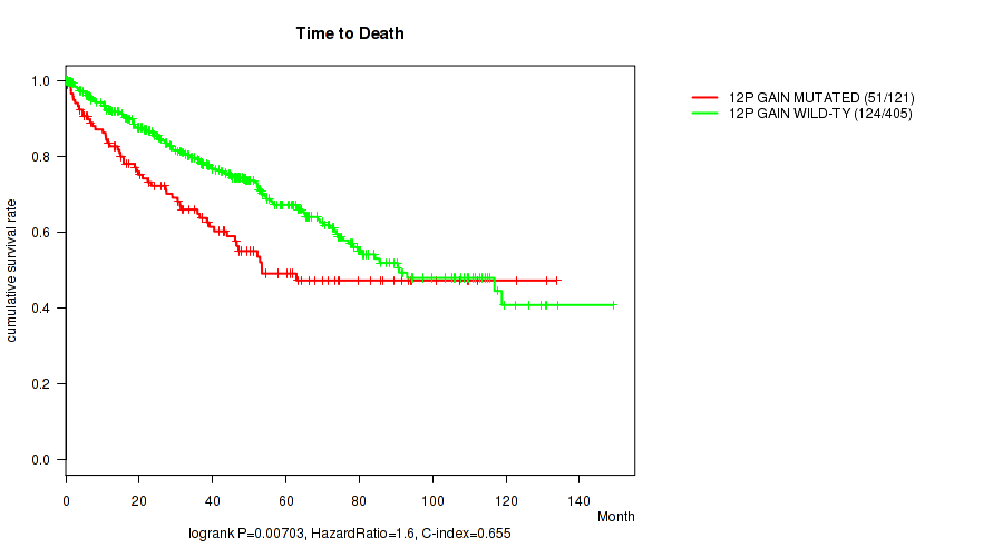 12p gain cnv correlated to 'Time to Death', 'PATHOLOGIC_STAGE', 'PATHOLOGY_T_STAGE', 'PATHOLOGY_M_STAGE', and 'KARNOFSKY_PERFORMANCE_SCORE'.
