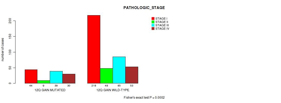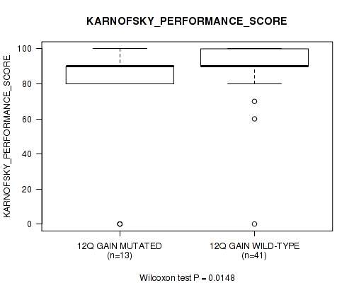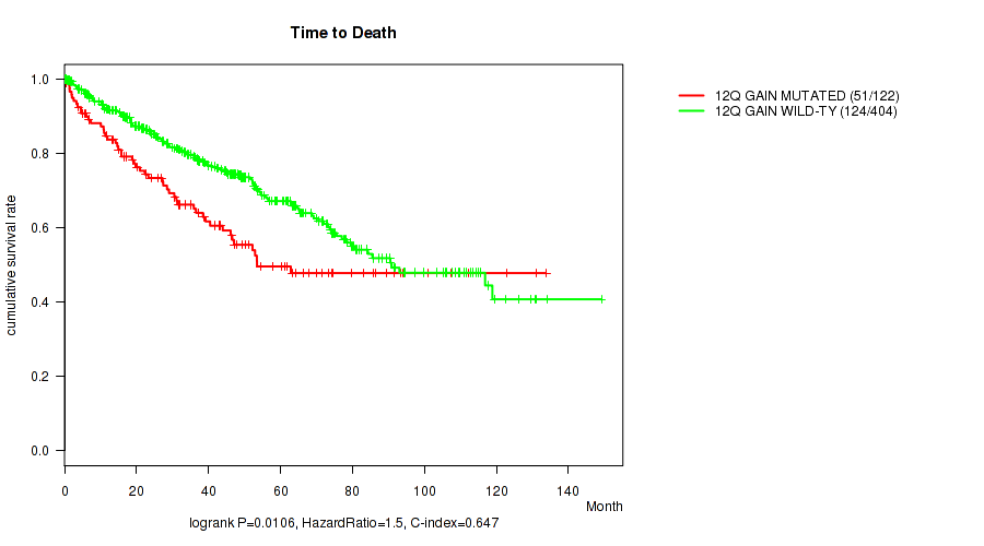12q gain cnv correlated to 'Time to Death', 'PATHOLOGIC_STAGE', 'PATHOLOGY_T_STAGE', 'PATHOLOGY_M_STAGE', and 'KARNOFSKY_PERFORMANCE_SCORE'.