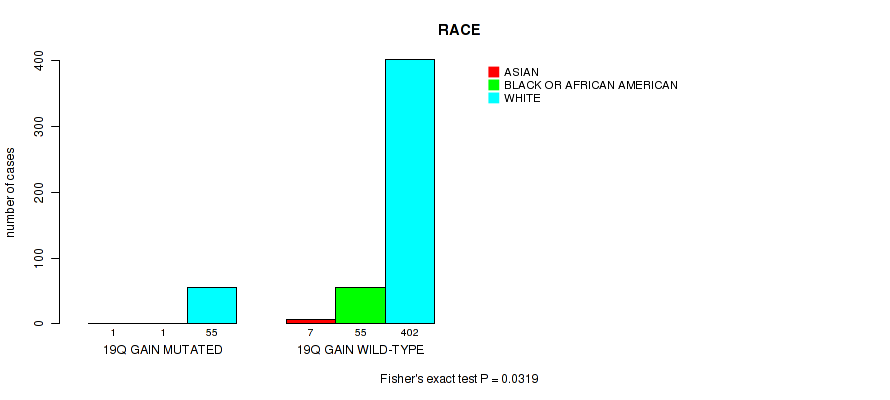 19q gain cnv correlated to 'PATHOLOGIC_STAGE', 'PATHOLOGY_T_STAGE', 'PATHOLOGY_M_STAGE', and 'RACE'.