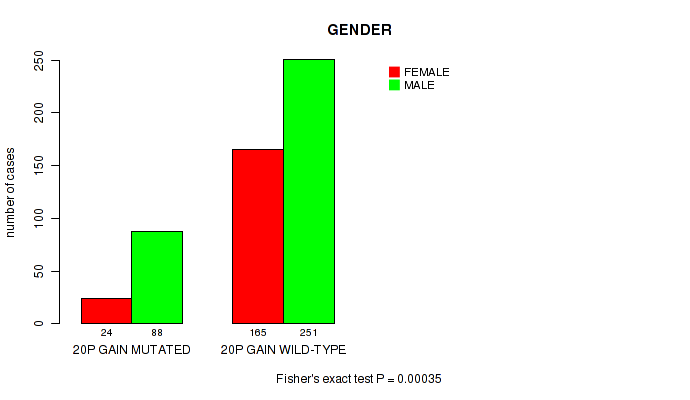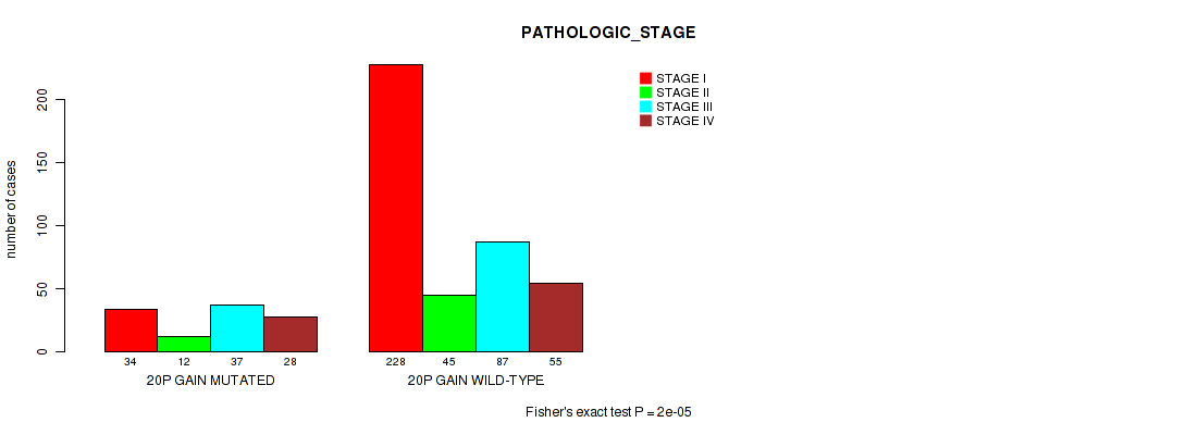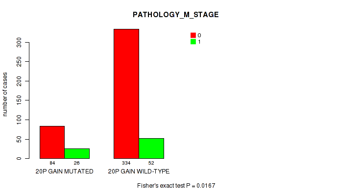 20p gain cnv correlated to 'PATHOLOGIC_STAGE', 'PATHOLOGY_T_STAGE', 'PATHOLOGY_M_STAGE', and 'GENDER'.