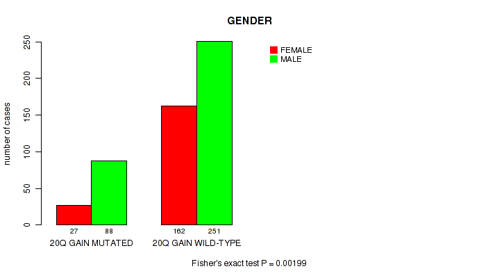 20q gain cnv correlated to 'PATHOLOGIC_STAGE', 'PATHOLOGY_T_STAGE', 'PATHOLOGY_M_STAGE', and 'GENDER'.