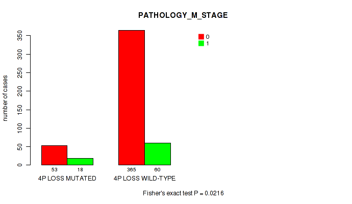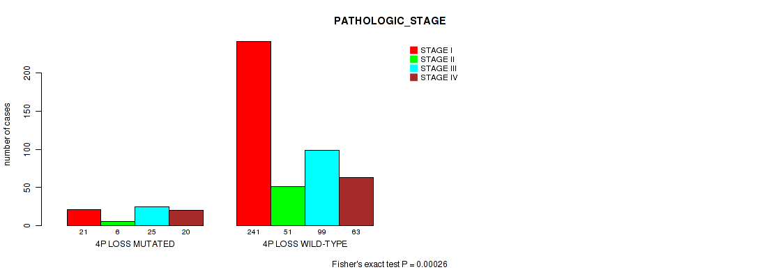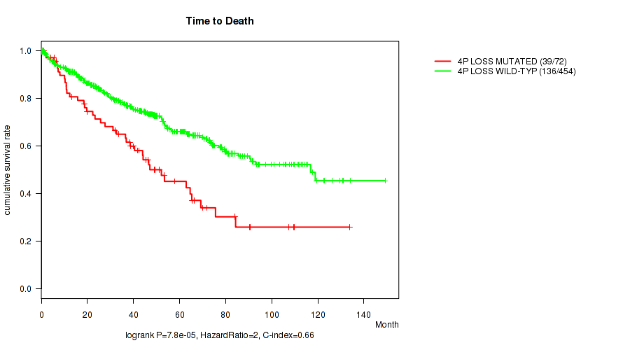 4p loss cnv correlated to 'Time to Death', 'PATHOLOGIC_STAGE', 'PATHOLOGY_T_STAGE', and 'PATHOLOGY_M_STAGE'.