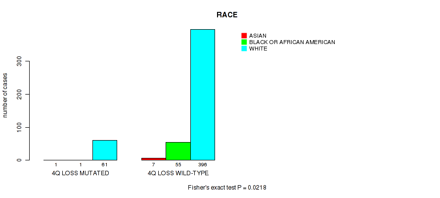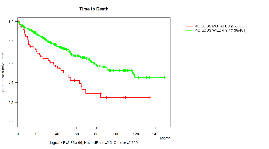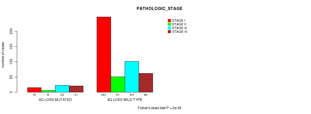 4q loss cnv correlated to 'Time to Death', 'PATHOLOGIC_STAGE', 'PATHOLOGY_T_STAGE', 'PATHOLOGY_M_STAGE', and 'RACE'.