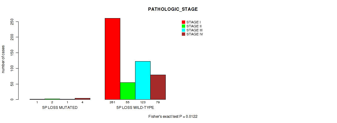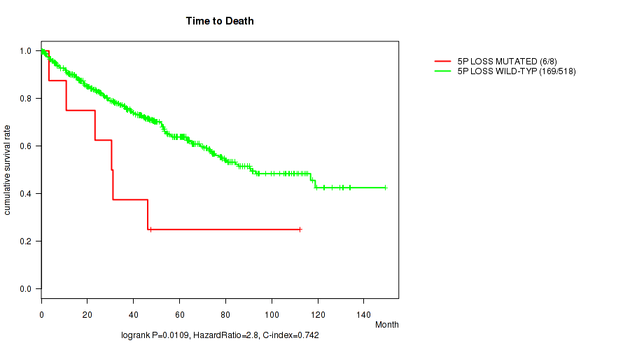5p loss cnv correlated to 'Time to Death', 'PATHOLOGIC_STAGE', and 'PATHOLOGY_T_STAGE'.