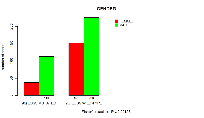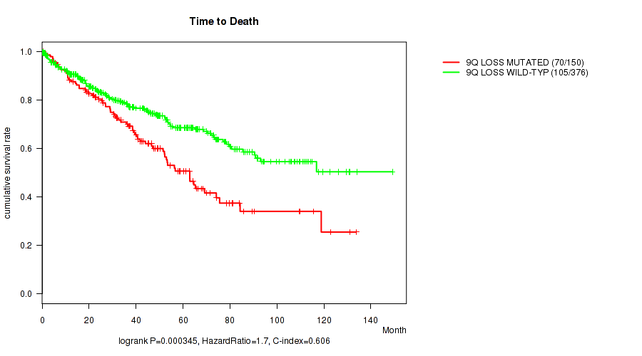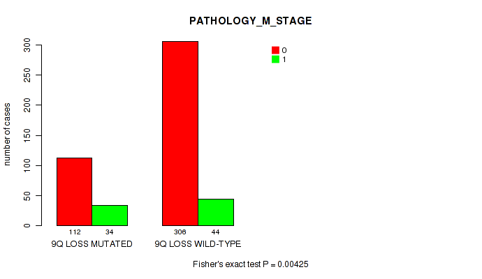 9q loss cnv correlated to 'Time to Death', 'PATHOLOGIC_STAGE', 'PATHOLOGY_T_STAGE', 'PATHOLOGY_M_STAGE', and 'GENDER'.