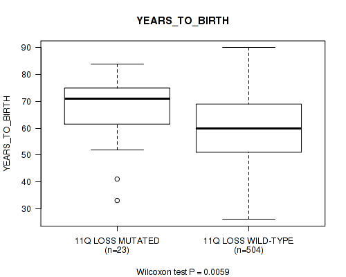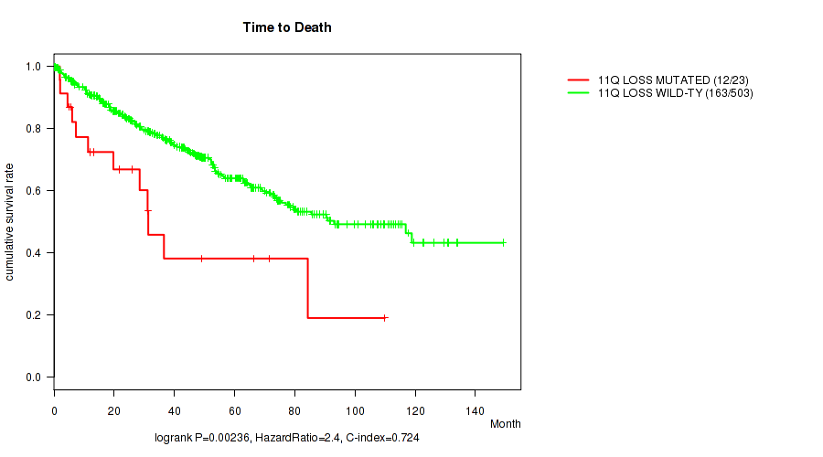 11q loss cnv correlated to 'Time to Death' and 'YEARS_TO_BIRTH'.