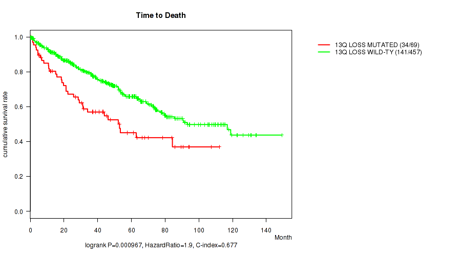 13q loss cnv correlated to 'Time to Death', 'PATHOLOGIC_STAGE', 'PATHOLOGY_T_STAGE', and 'PATHOLOGY_M_STAGE'.