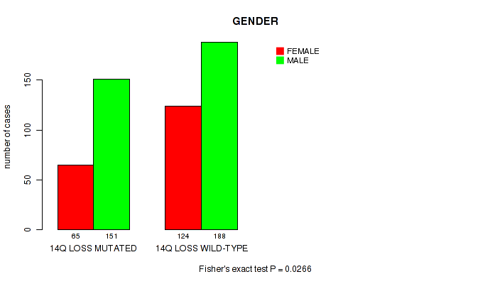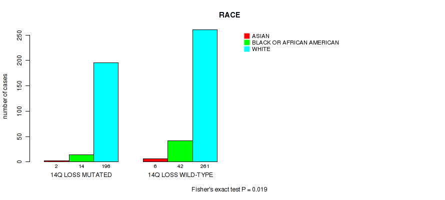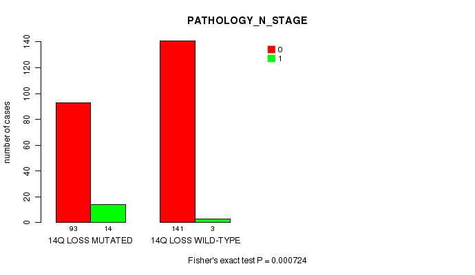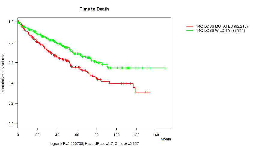 14q loss cnv correlated to 'Time to Death', 'PATHOLOGIC_STAGE', 'PATHOLOGY_T_STAGE', 'PATHOLOGY_N_STAGE', 'PATHOLOGY_M_STAGE', 'GENDER', and 'RACE'.