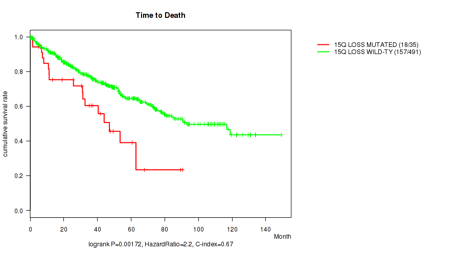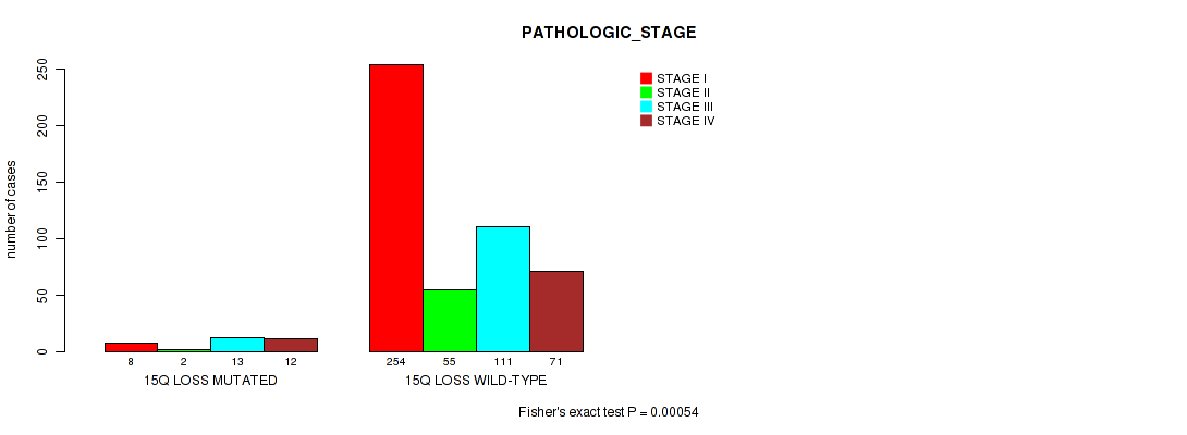15q loss cnv correlated to 'Time to Death', 'PATHOLOGIC_STAGE', 'PATHOLOGY_T_STAGE', and 'PATHOLOGY_M_STAGE'.
