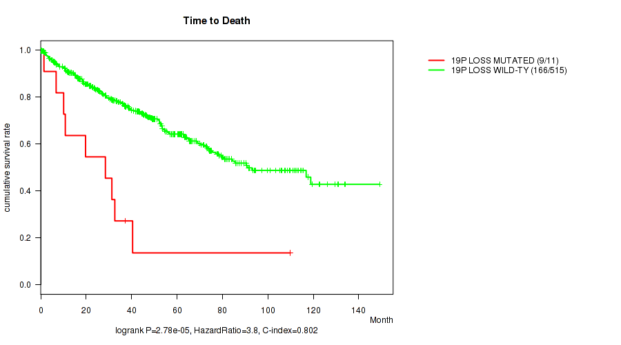 Figure S119. Get High-res Image Gene #73: '19p loss' versus Clinical Feature #1: 'Time to Death'