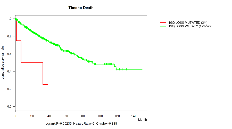 Figure S122. Get High-res Image Gene #74: '19q loss' versus Clinical Feature #1: 'Time to Death'
