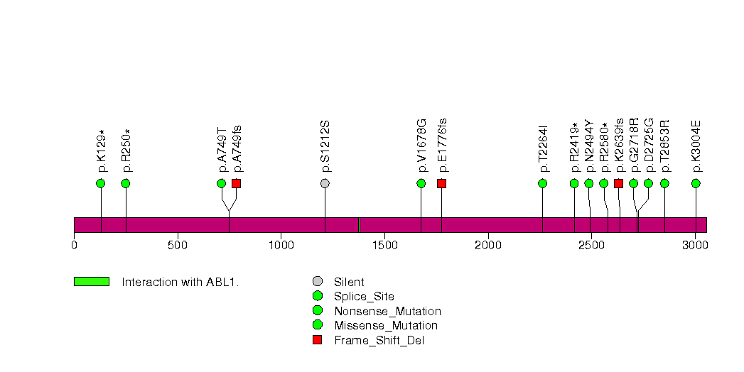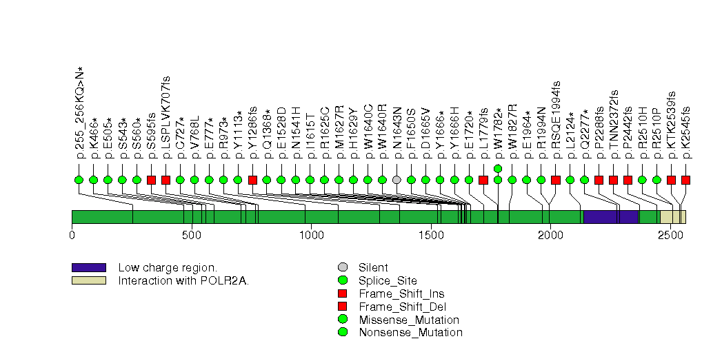 Figure S1. This figure depicts the distribution of mutations and mutation types across the SETD2 significant gene.