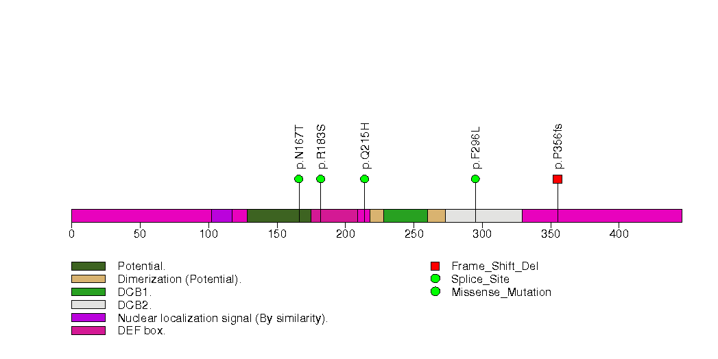 Figure S13. This figure depicts the distribution of mutations and mutation types across the TFDP2 significant gene.